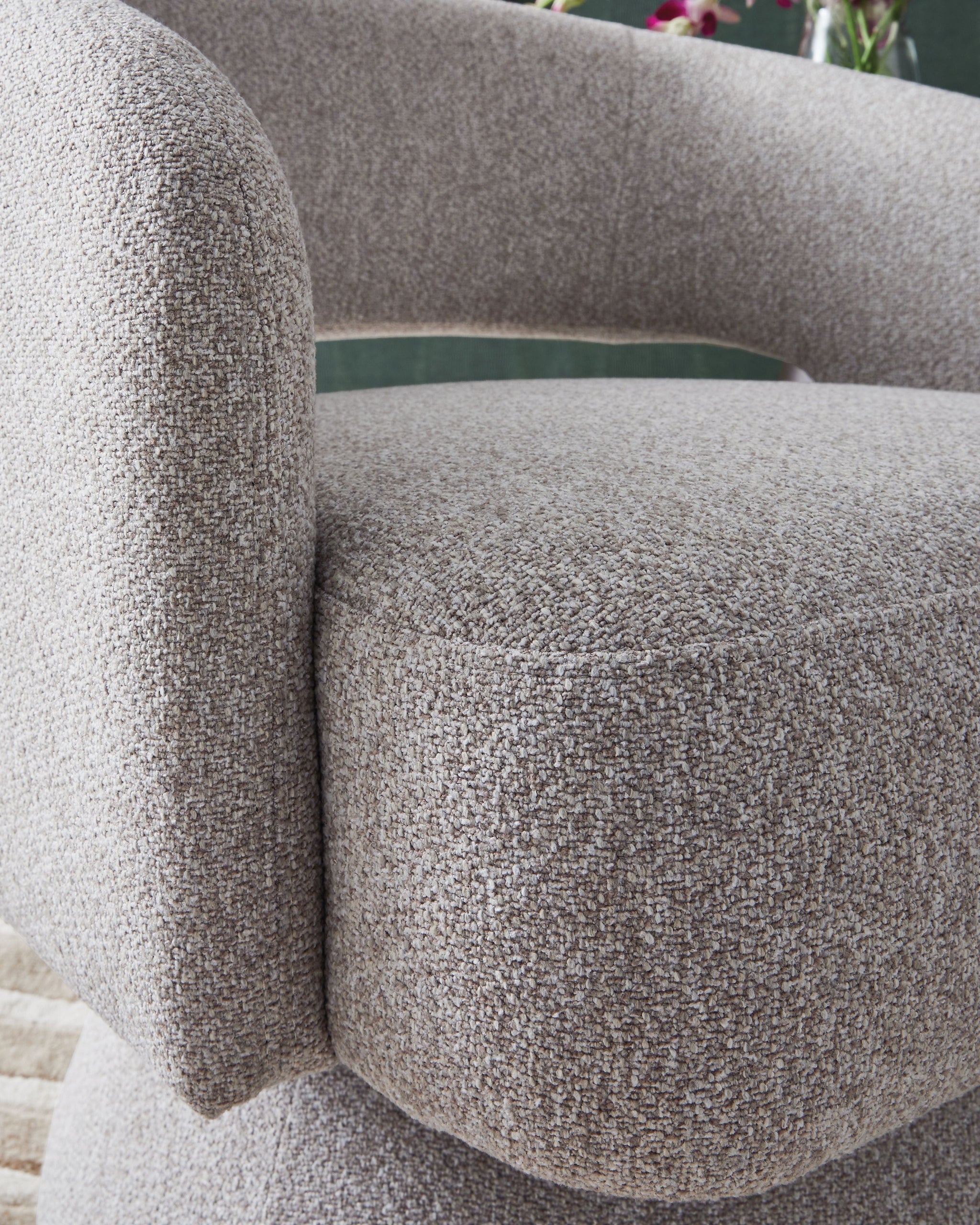 Indulge in the luxurious comfort and effortless style of this swivel accent chair. Its fine boucle upholstery and open barrel back create a chic and inviting look. And the 360-degree swivel base adds function to all that fabulous form.