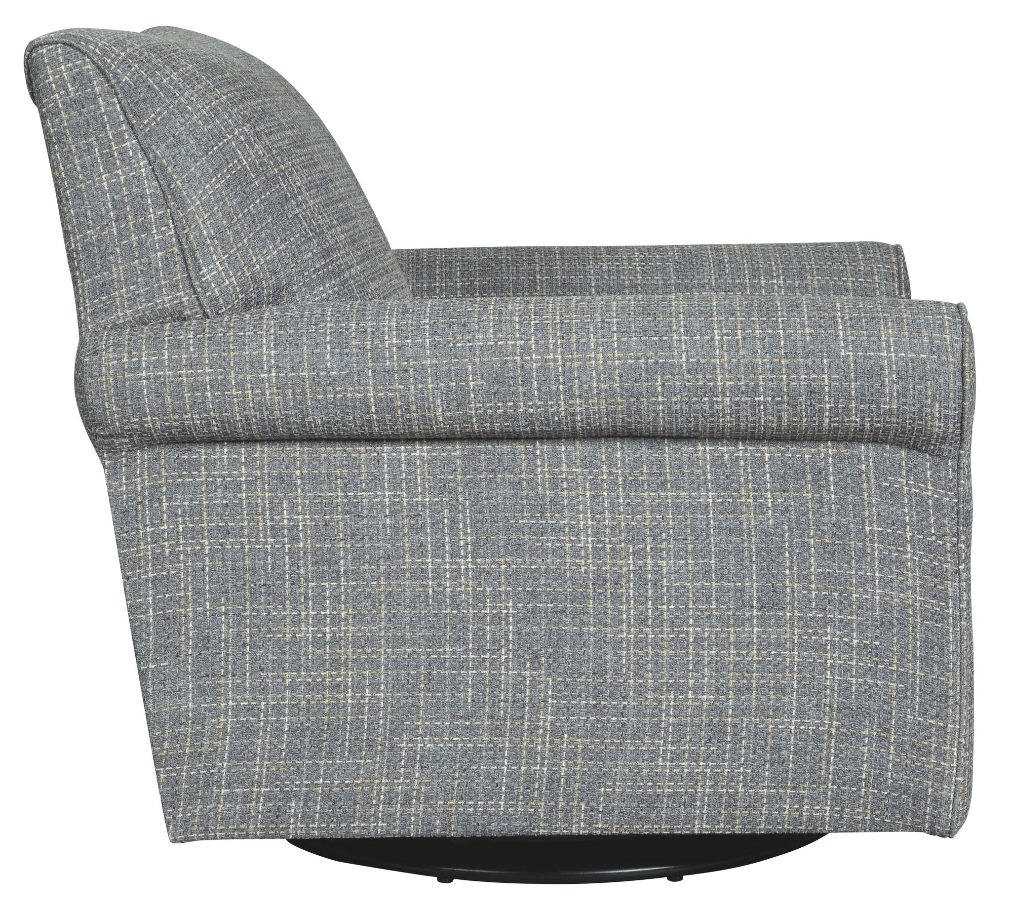 Sporting a tantalizing tweed weave fabric in such a soothing blue hue, this swivel glider accent chair gives the classic roll arm chair a modern twist. Smooth, 360-degree swivel caters to your comfort—and your viewing pleasure. Gentle glider feature is designed to rock your cares away.