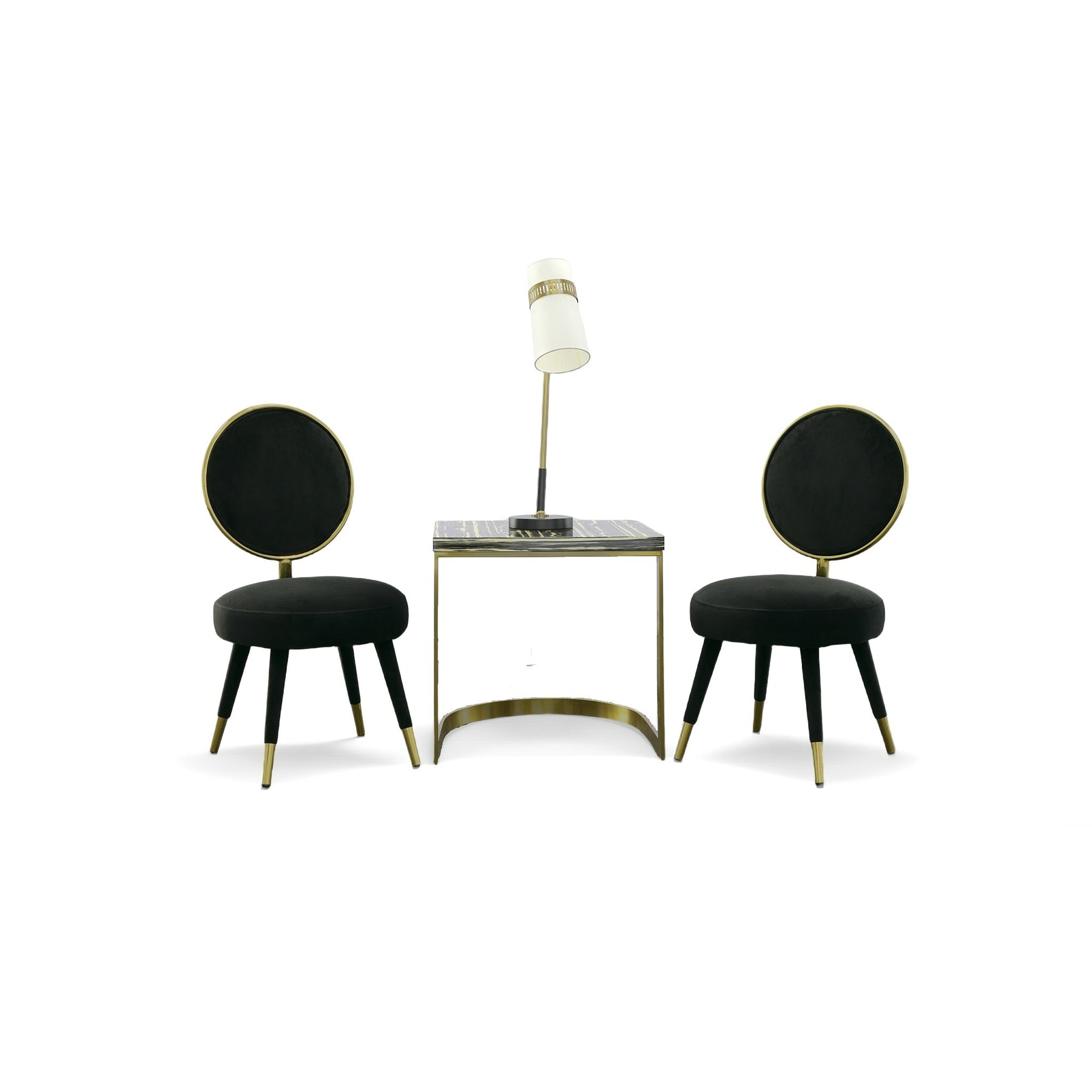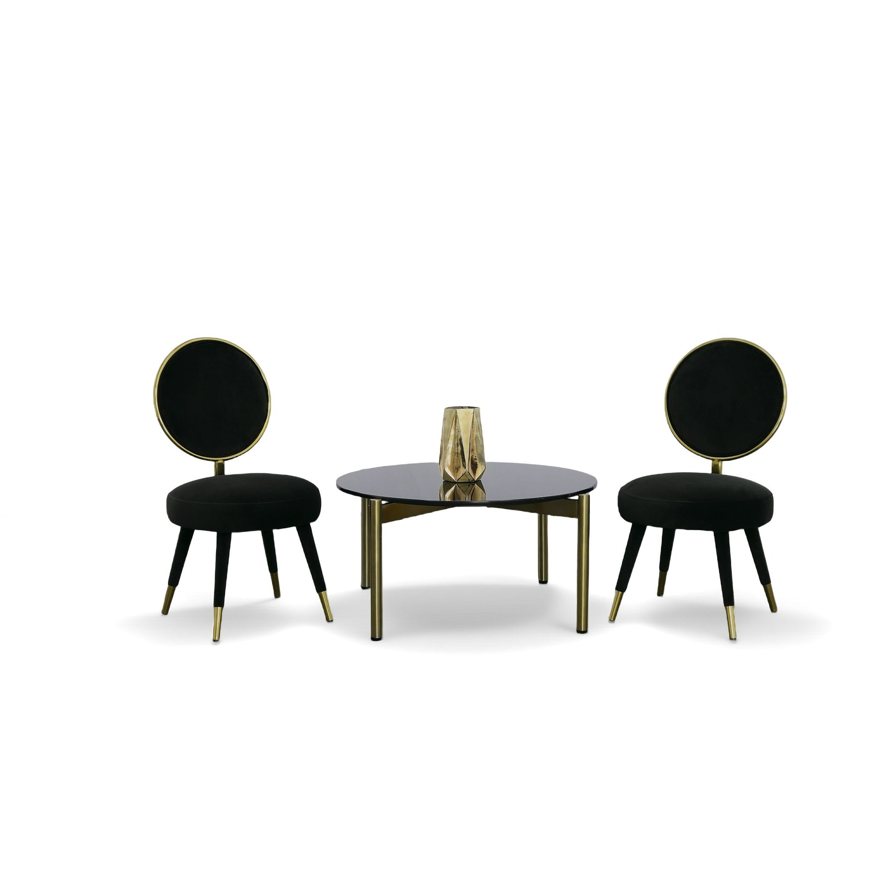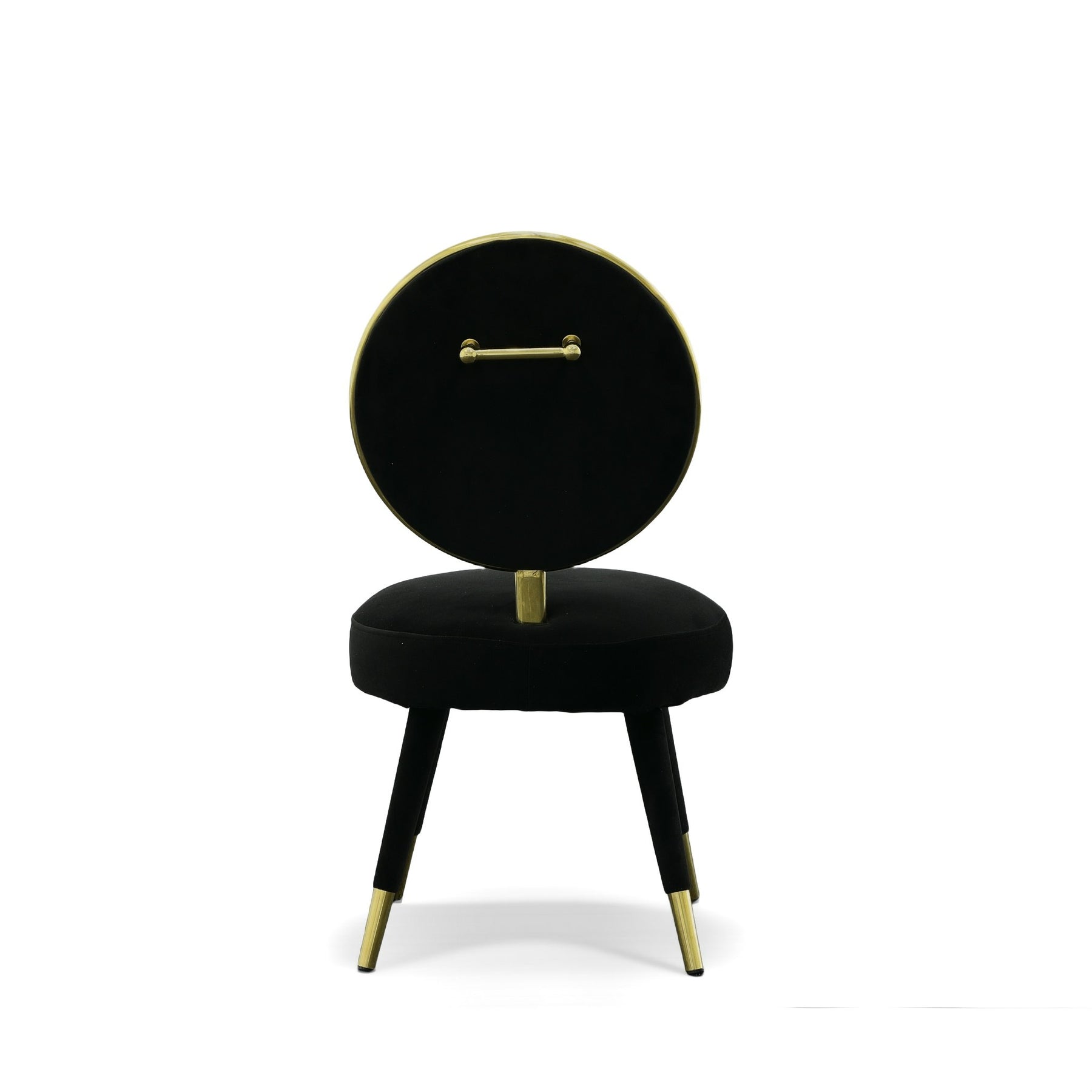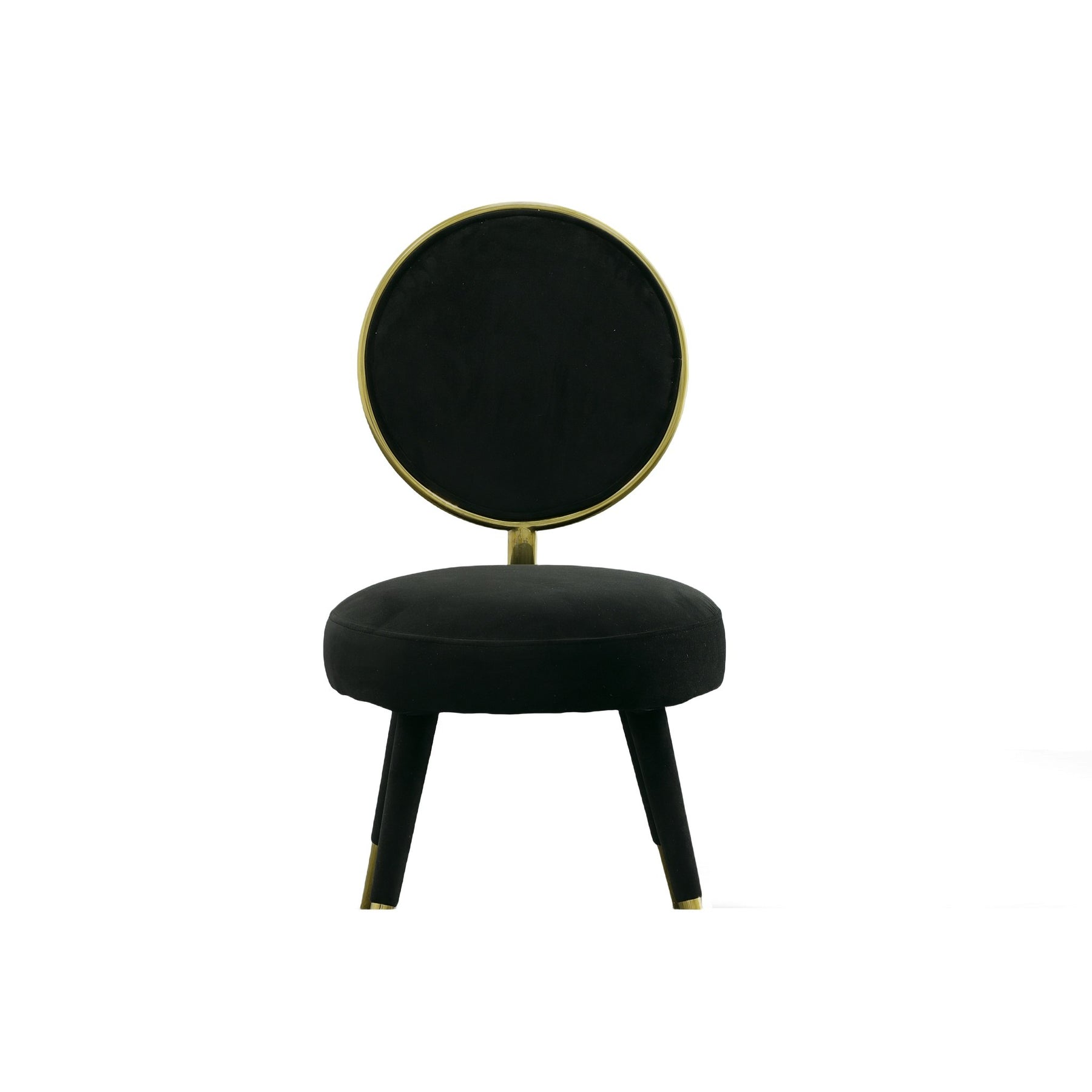 The Haswell Accent Chair is a stylish glam piece that brightens any space it enters. The round shape and gold accents take a mod look and elevate it. The bold black velvet upholstery wraps around the circular silhouette while the gold chrome frames the back and caps the legs. Sure to emphasize any space.