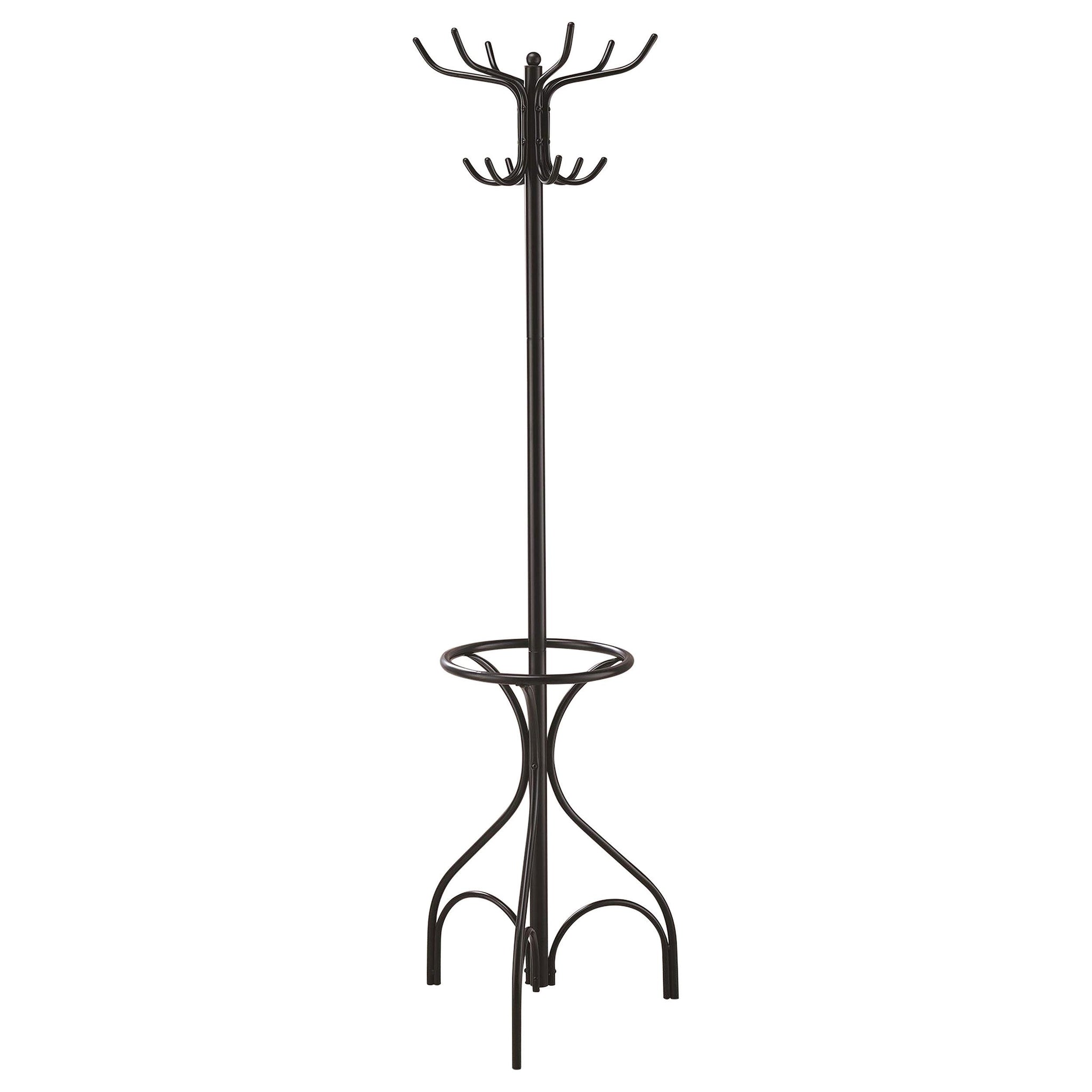 This classic coat rack offers a sleek and functional solution for entryways or office spaces. Finished in black, it features a sturdy metal construction with multiple hooks arranged at two heights for jackets, hats, and accessories. The curved base ensures stability, while the integrated umbrella ring adds everyday convenience. Its vertical design saves space while keeping essentials easily accessible and organized.