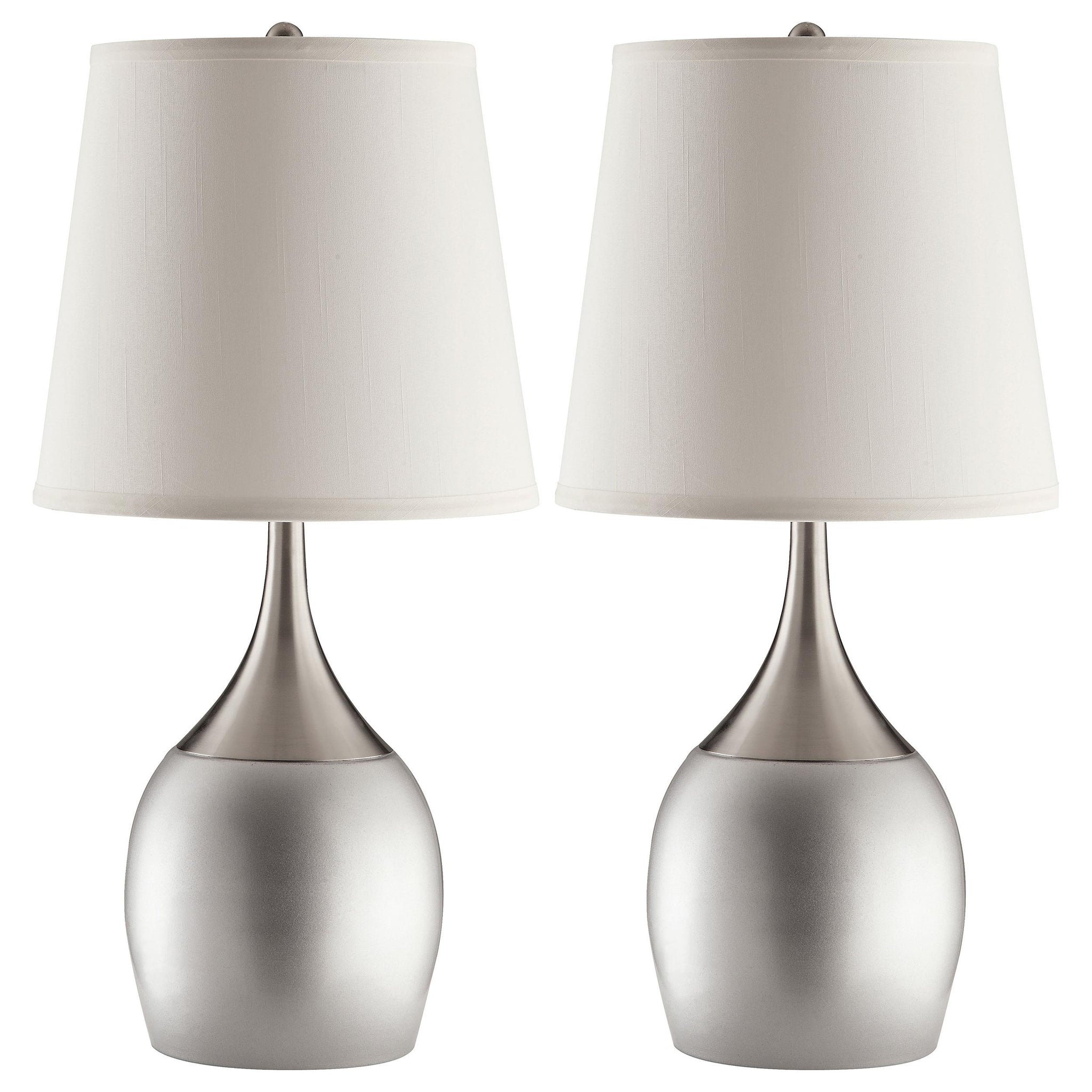 This pair of modern table lamps blends a graceful teardrop base with a brushed silver finish and classic empire shade. Designed for balance and symmetry, each lamp features an urn-shaped silhouette with a gently tapered neck, creating soft visual flow. The clean white shades diffuse light beautifully, making this matching set ideal for flanking beds, sofas, or consoles in any modern or transitional space.