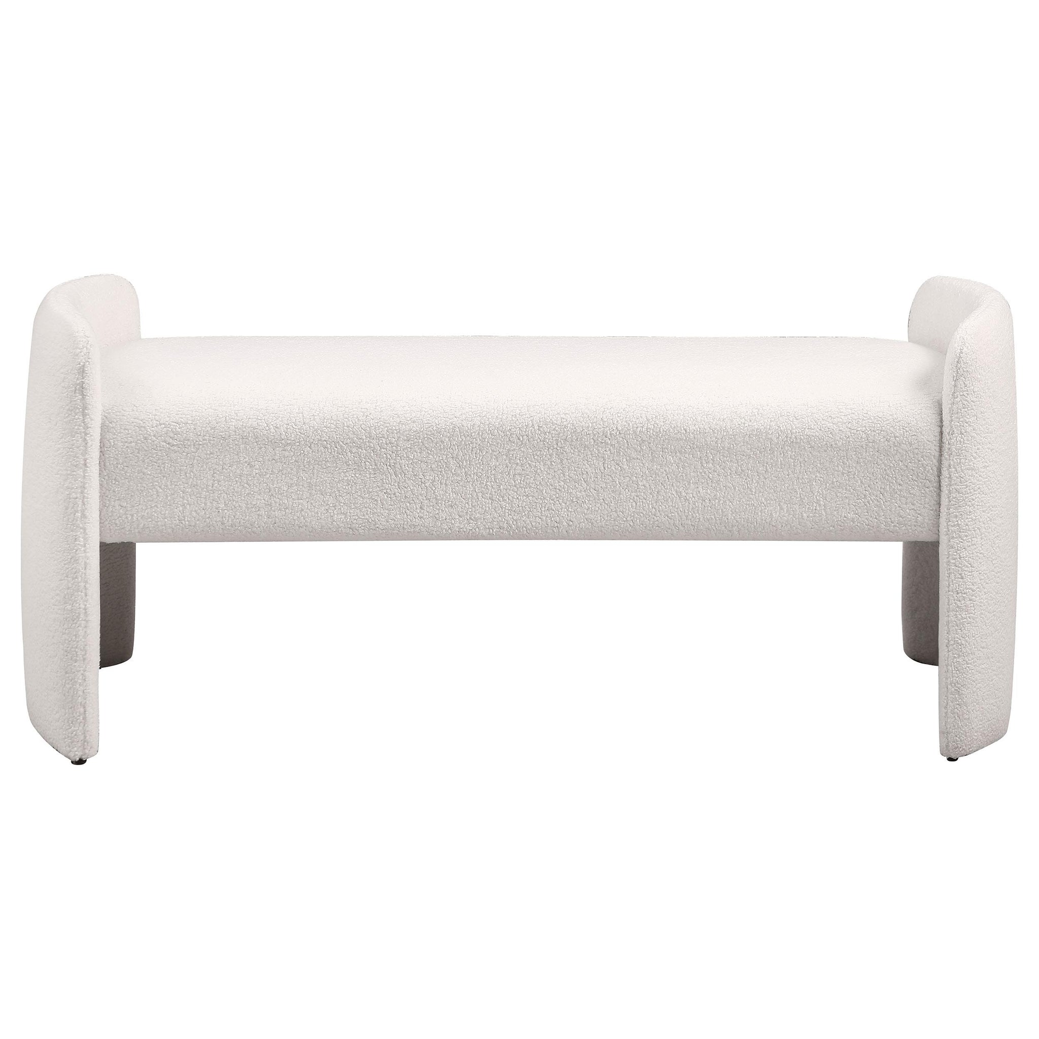 Soften the foot of your bed or a living room wall with the inviting nature of a modern accent bench. Its a charming choice, offering an interesting silhouette complete with rounded supports that extend upward to create arms. The bench is padded with foam for excellent comfort. Ivory boucle upholstery fabric is soft and textured, creating depth and dimensionality in your space. This bench features a contemporary profile, perfect for a modern bedroom, foyer, or living room.