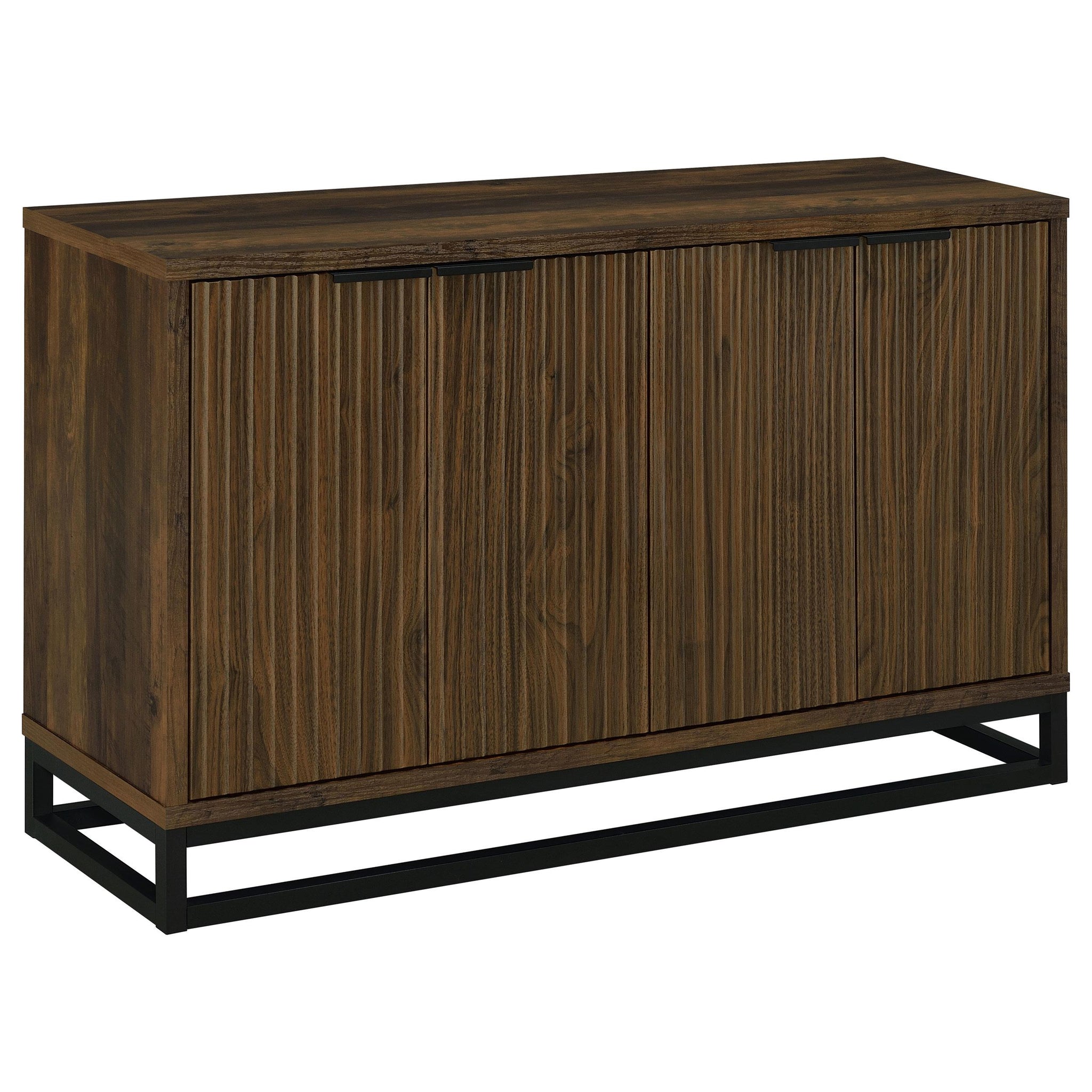 Clean lines and a bold finish beef up the aesthetics of an accent cabinet that will transform your dining room or living space in sleek style. The Ryatt accent cabinet delivers rustic beauty with a dark pine finish over wood products construction. A hint of industrial flavor adds an edgy look to this spacious cabinet featuring carved, fluted door fronts. Four doors open to provide access to storage on two fixed shelves. A black metal cross bar base is linear and compelling.