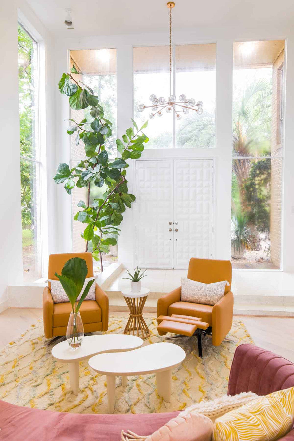 The envelope shaped arms and back sit atop a memory swivel bringing additional function to a soft form. The swivel base is available in Polished Nickel, Burnished Bronze, or Antique Brass. At first glance, you may not realize that there's a hidden recline function that activates with a simple push back motion. The Blake is the perfect balance of style, comfort, and functionality without the bulk of a traditional recliner.