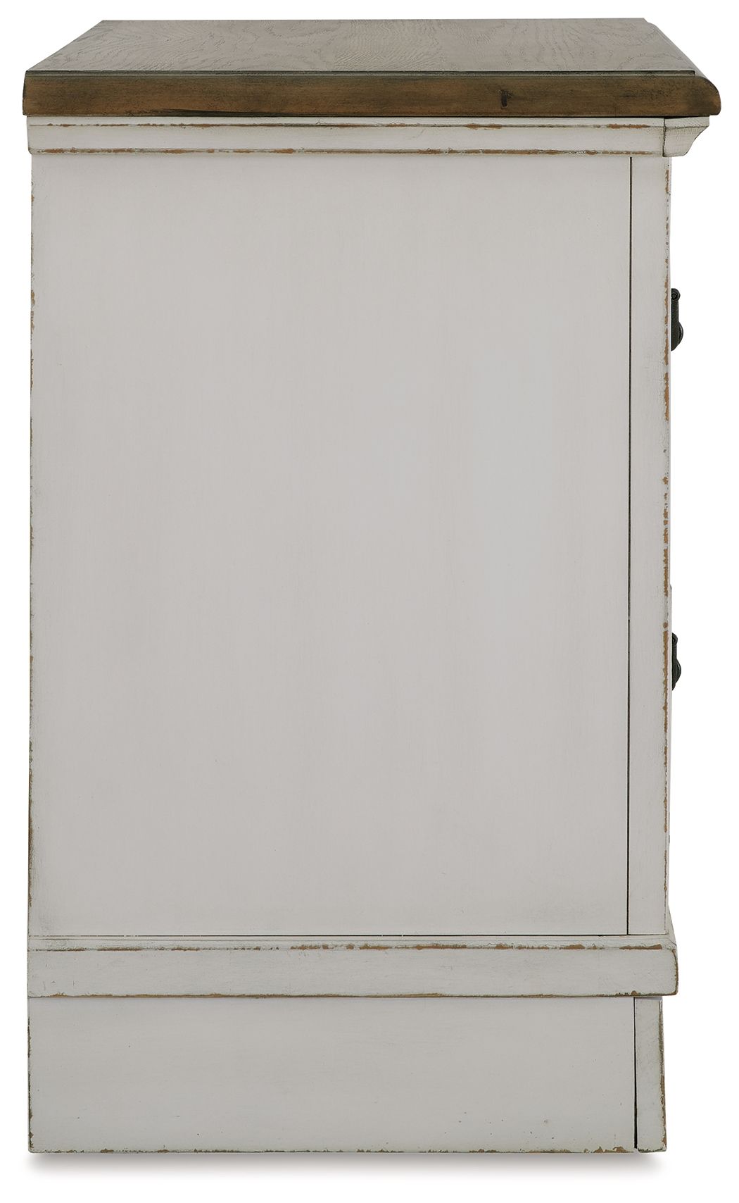 Made with hardwood solids, select wood veneer and MDF substrateTwo-tone finish (chipped white and brown wood-tone)Profiled drawer fronts and pilastersWaist mouldingMetal hardware with dark bronze-tone finish2 smooth-gliding drawers with fully finished interiors, dovetail construction and metal ball-bearing side glides (top drawer felt lined)Assembly required