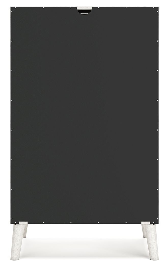 Dare to take minimalism to the max. This chest of drawers has an air of sleek simplicity thanks to its white painted finish with subtle replicated wood grain. Magnificently mod splay legs are a compelling complement to the streamlined design. And with two sets of faux leather drawer pulls that allow you to customize the chest to suit your space, theres no doubt about it: This contemporary piece is sure to become a classic.