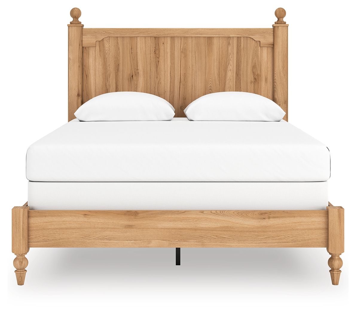 Country rustic. Vintage inspired. However you see it, you’re sure to be charmed by this queen panel bed and its relaxed mix of picturesque aesthetics. A gracefully shaped rail brings dimension to the headboard, while decorative ball tops and turned legs adorn the silhouette in quaint fashion. A warm oak grain finish enhances the beds air of easygoing elegance, letting you drift away to a simpler time and place.