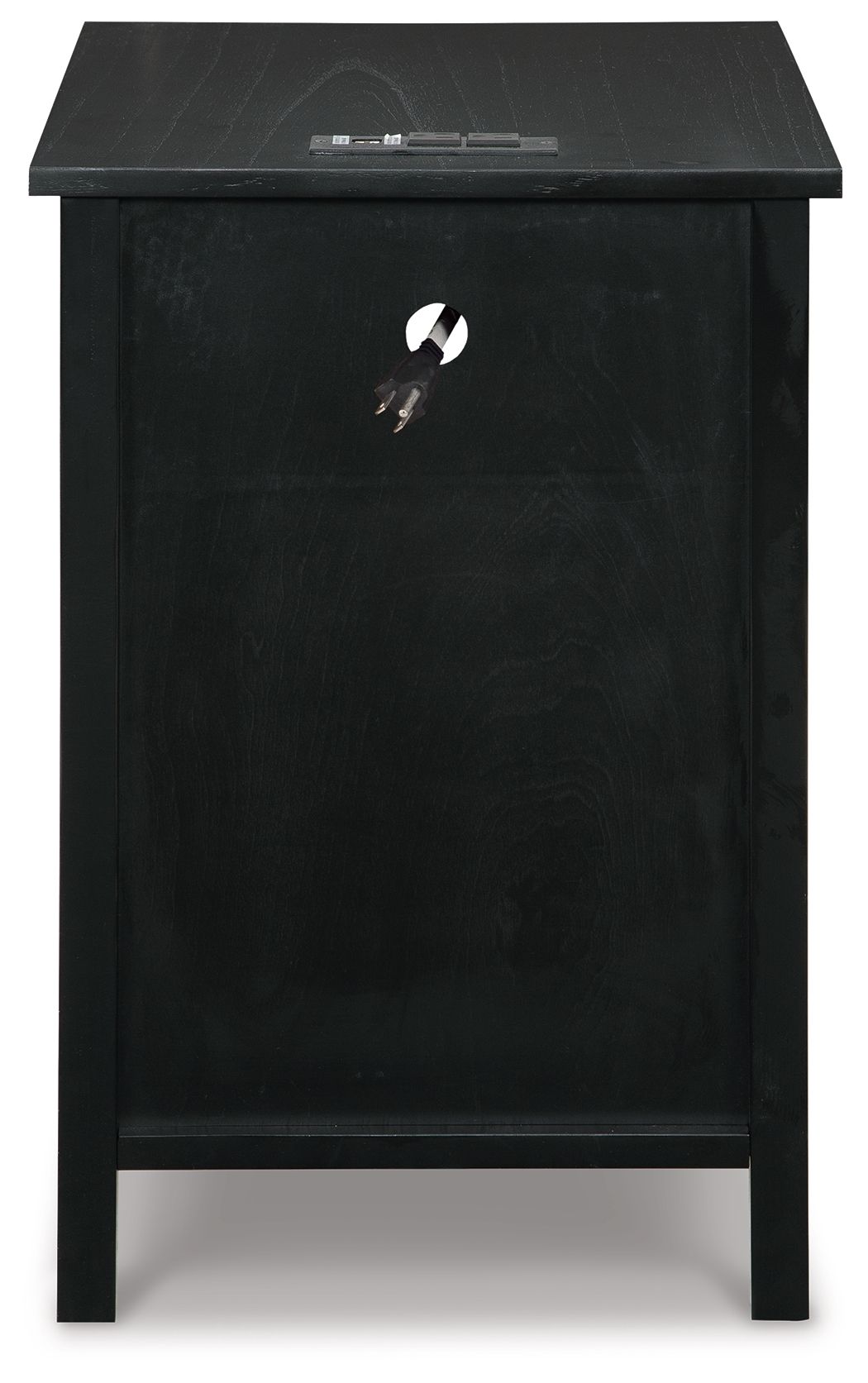 Add big character to a small space with this chairside end table. With its compact size and strong silhouette, it can go anywhere and blend easily into the decor. Less is so much more with the Shaker-inspired design and black wood tone finish. Loaded with form and function, this end table displays accent pieces and stores essentials securely while keeping devices powered up.