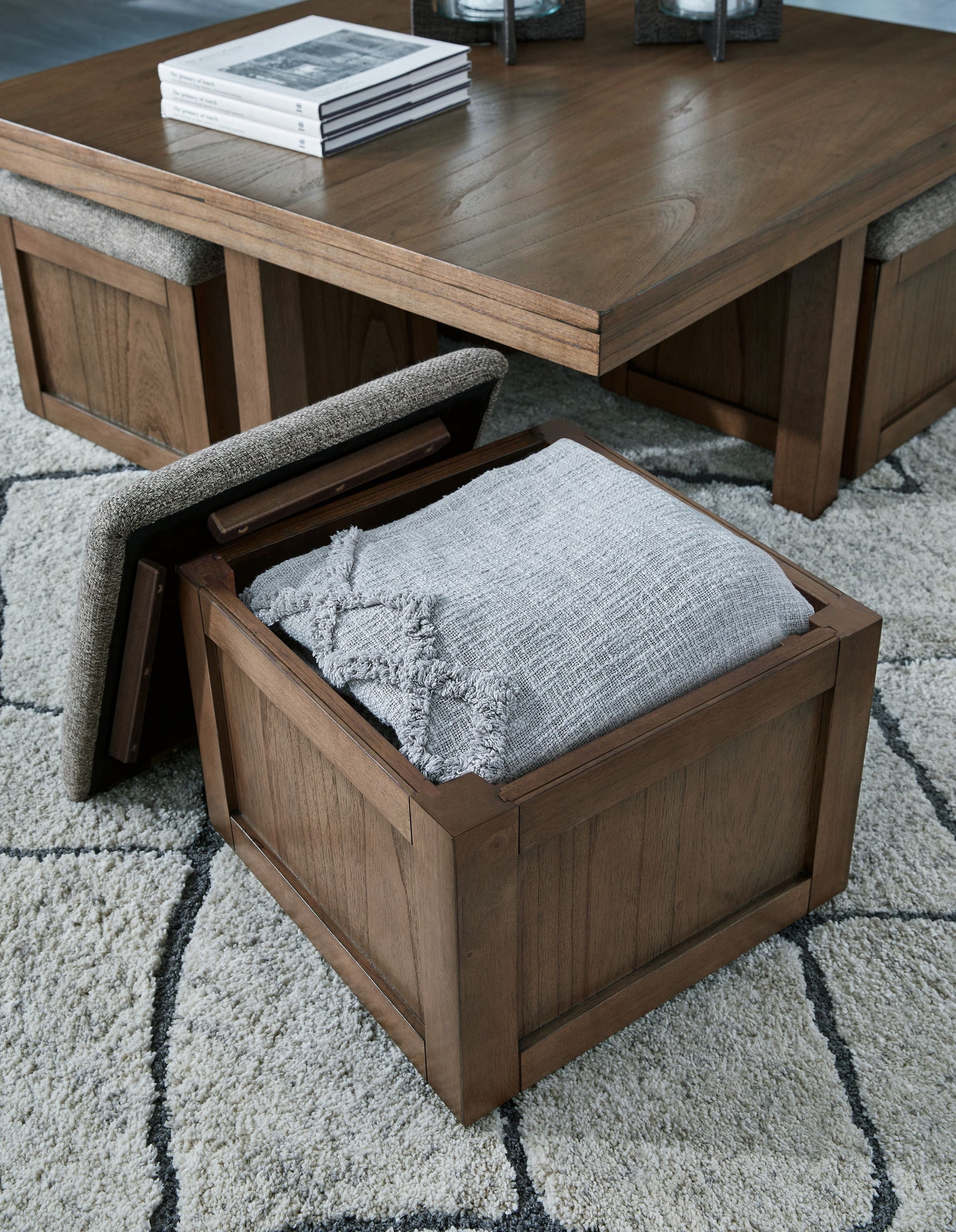 Includes coffee table with 4 stoolsMade with hardwood solids, acacia veneer and MDF substrateRich light brown finish enhances the natural wood grain characteristicsTextured polyester fabricStools with casters for easy mobilityStorage under removable stool tops