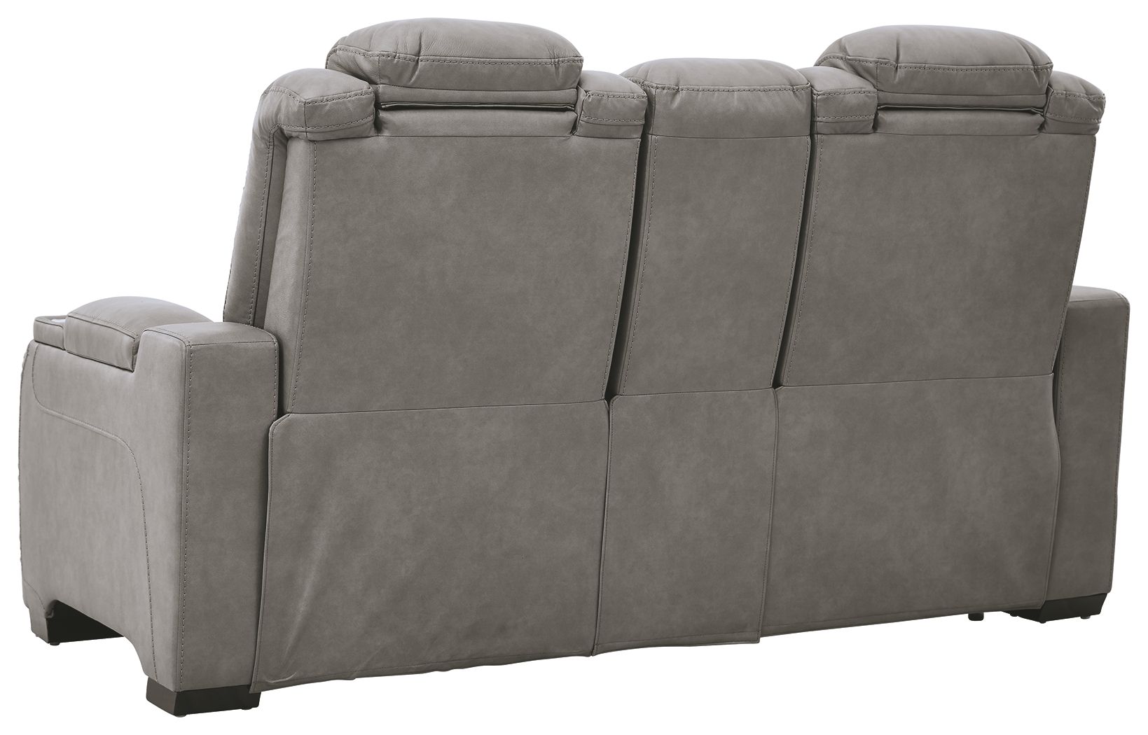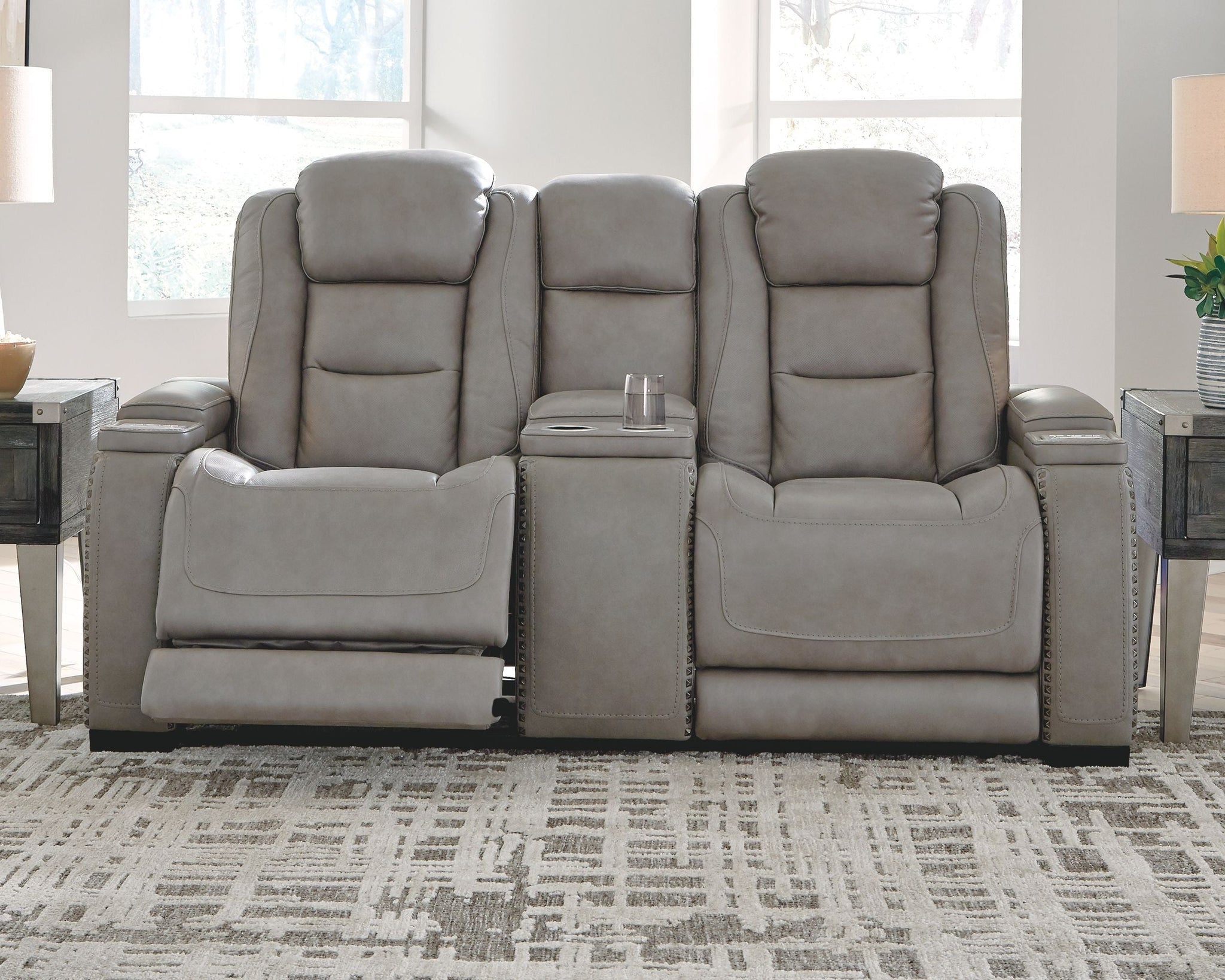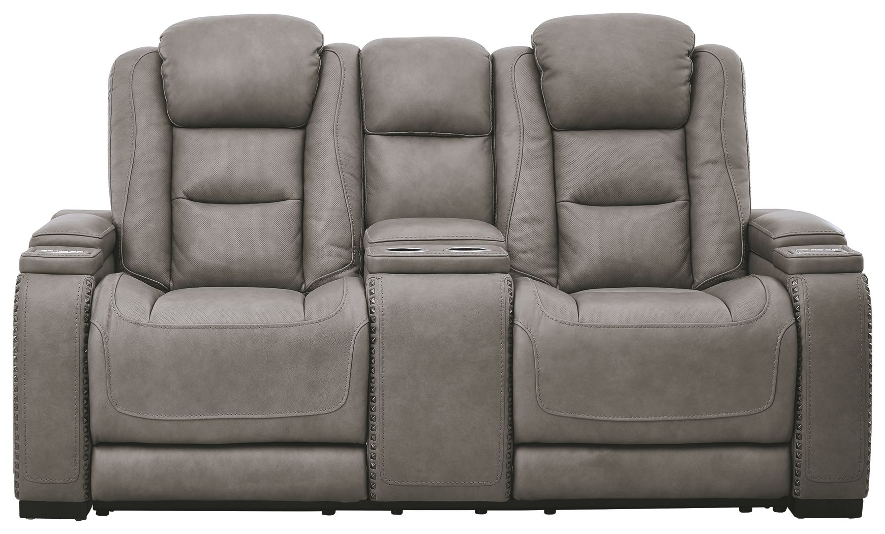 Reserved for him and made for her, this power reclining loveseat in gray delivers all the comfort and style you could ask for. Inspired by sports car interiors, the expertly matched leather and faux leather upholstery has a “perforated automotive” treatment for that much more appeal. Positioned at your fingertips, the advanced one-touch power control puts you in the driver’s seat with everything from an Easy View™ power headrest and power lumbar support, to a USB port and wireless charging for your phone. Talk about fully loaded. And with integrated cup holders and hidden storage compartments under the posh, padded armrests, this designer power reclining loveseat makes the most of every inch of space.