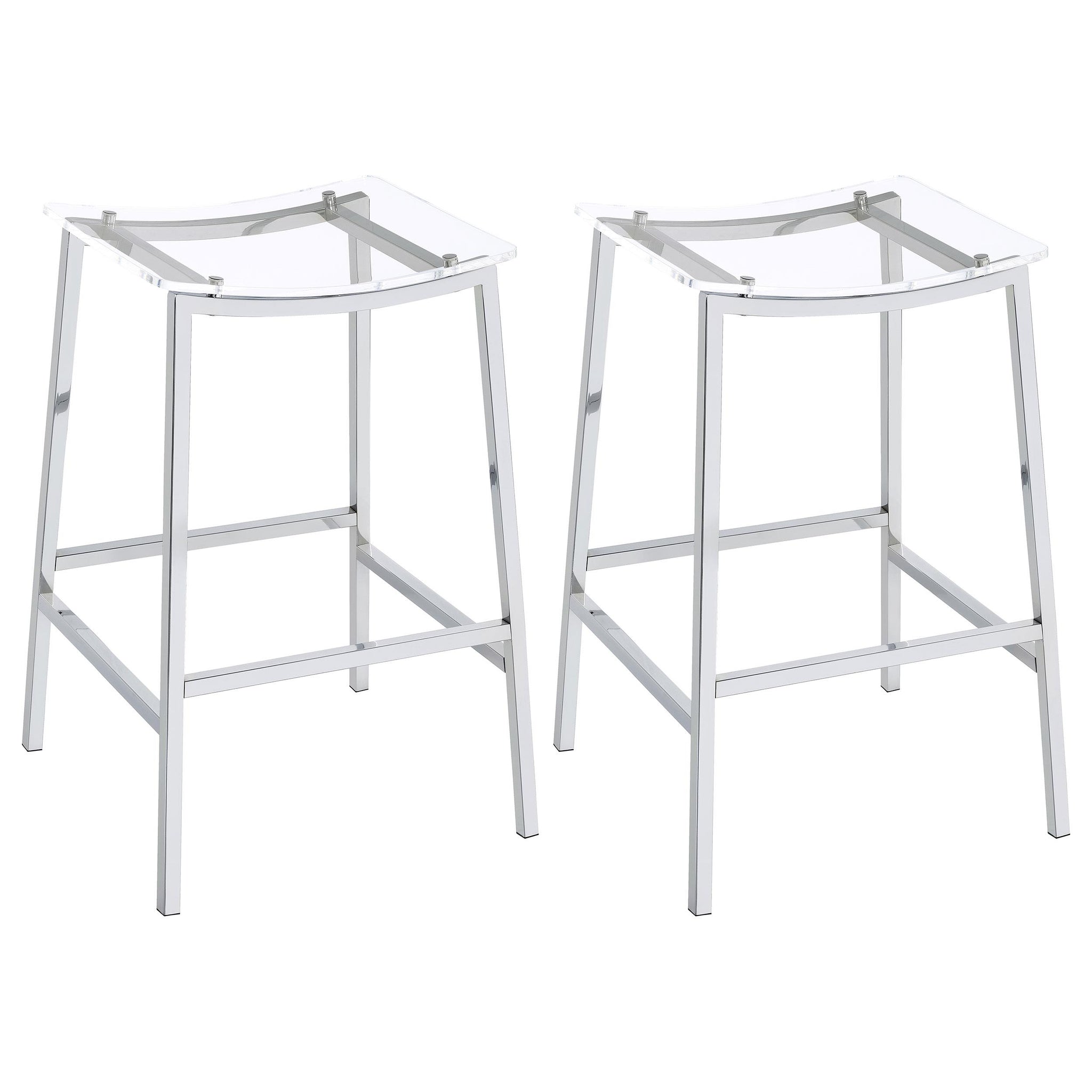 Updated to reflect the carefree contemporary style you crave, this set of two bar stools uses modern materials and finishes to bring a crisp look. Perfect for casual seating at a bar table or counter, these stools are lightweight yet sturdy. Gleaming chrome finish metal framing includes a two-bar seat support and built-in footrests. A gently curved seat made of acrylic reveals the nuts and bolts of metal framing. Add this bar stool set to your easy-living space for entertaining and family meals.