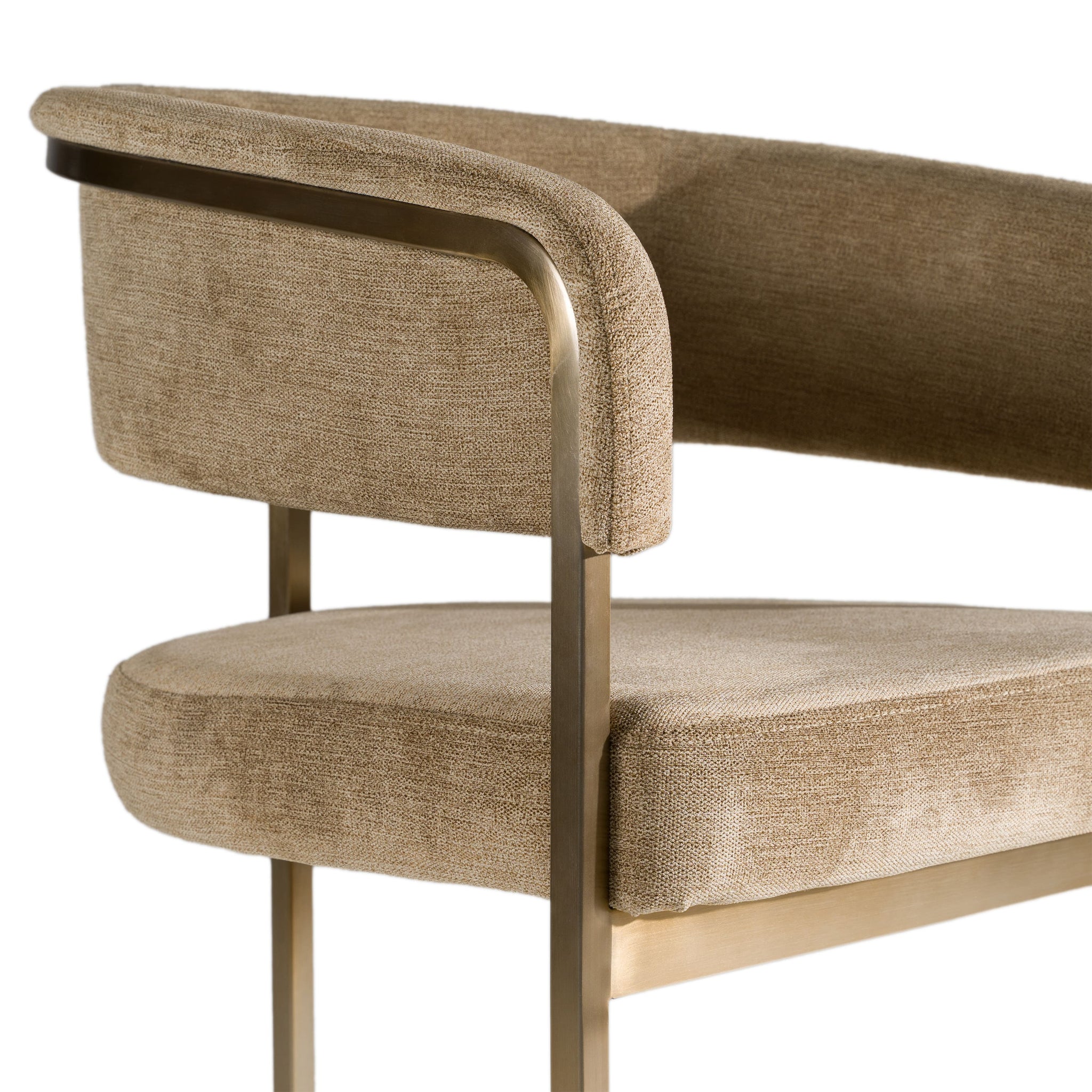 The Modrest Sebastian Counter Chair exudes modern elegance with its sleek design and sophisticated color palette. Upholstered in a warm brown fabric, it features a gently curved backrest that offers ergonomic support. The antique brass framework adds a touch of vintage charm, perfectly complementing the soft fabric. This bar stool is ideal for contemporary spaces, providing both comfort and style, making it a standout piece for any kitchen or dining area.