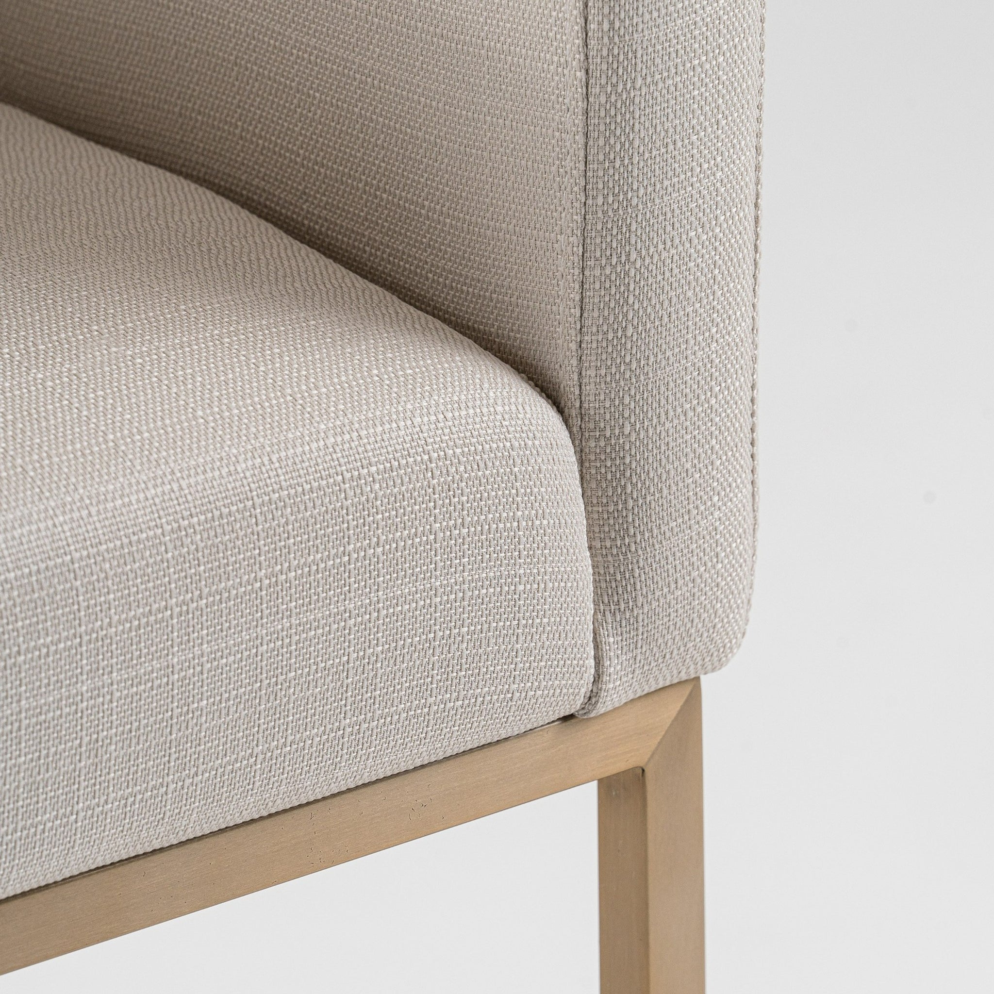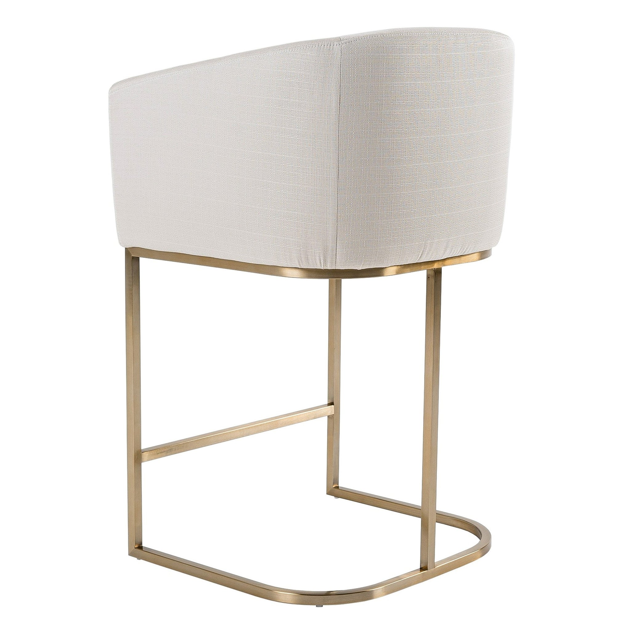 The Modrest Yukon counter chair exudes modern elegance with its off-white fabric upholstery and sleek brushed brass base. Its rounded arms and cushioned seat provide comfort while maintaining a chic silhouette, perfect for contemporary spaces. The minimalist design showcases refined craftsmanship, making it an ideal addition to any bar or countertop setting. With its striking color combination and stylish form, the Yukon chair seamlessly blends function and aesthetic appeal, elevating the atmosphere of any interior.
