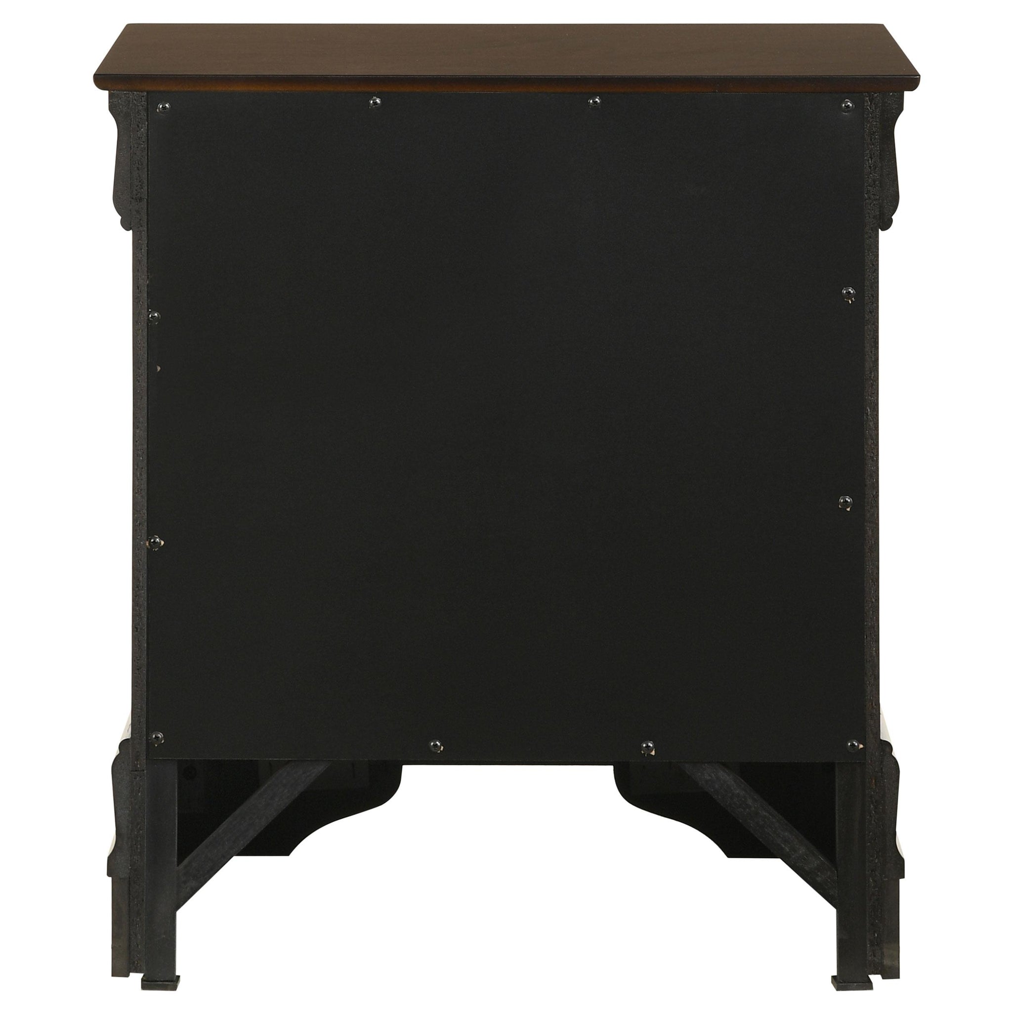 Honor classic simplicity with this two-drawer nightstand. Slightly tapered legs add dimension that balances the tapering of the top of the silhouette. A rich cappuccino finish creates a warm and welcoming effect. Constructed of wood veneer and select hardwoods, this nightstand looks great topped with candles or flowers. Bright metallic hardware creates a contrast against the deep, traditional hues and silhouette.