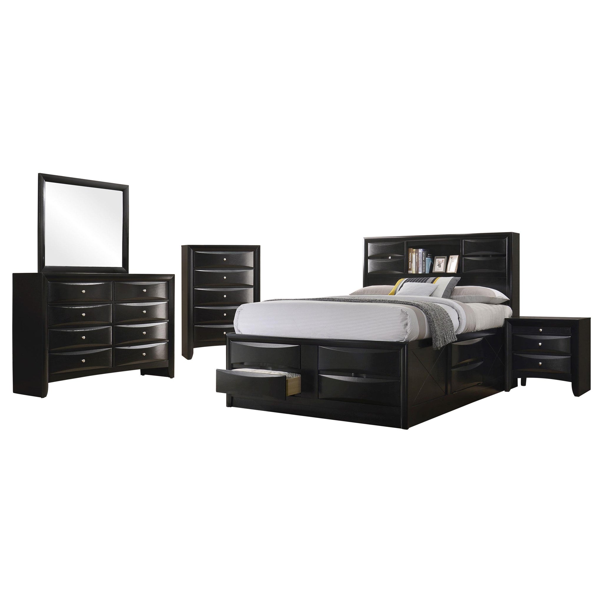 From the Briana collection comes this smooth, transitional style 5-piece bedroom set for a primary suite. The handsome storage bed offers function and fashion with drawers in the footboard as well as storage compartments behind drop down doors in the headboard and right side. The chest, nightstand, and dresser are constructed with plenty of drawers with chambered edge fronts and brushed chrome knobs, affording ample storage space with added stylishness. The straight, clean rectangular mirror easily fits upon the stately dresser finish out the set. The entire set is finished in timeless black thats sure to match any home decor.