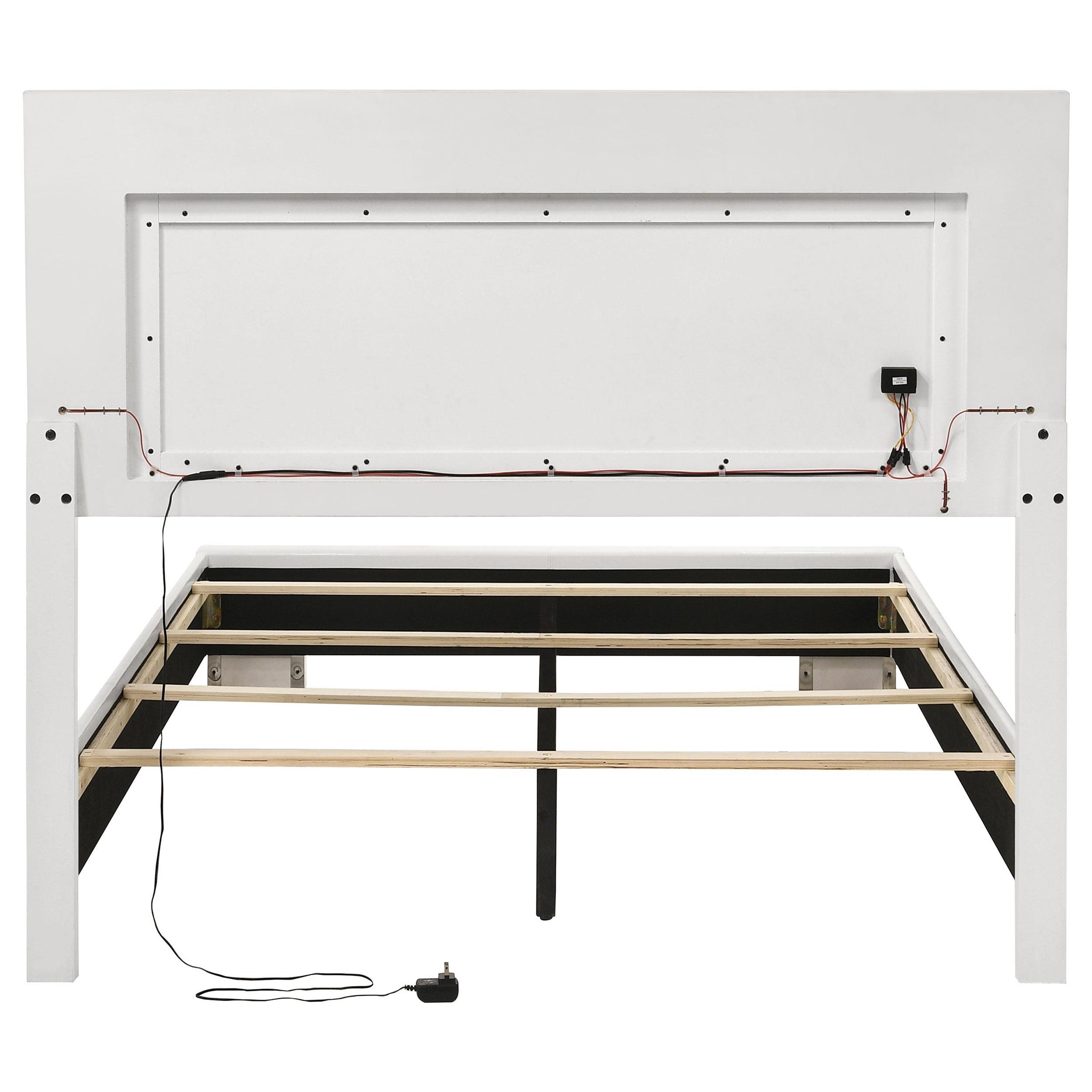 Illuminate your bedroom with the modern design of this LED bed. The headboard features a sleek white high gloss frame with built-in blue LED lighting, operated by a touch switch for convenience. The bed frame is upholstered in smooth white faux leather, enhancing its contemporary appeal. Designed for style and comfort, this bed brings a striking yet functional centerpiece to your space, blending modern aesthetics with subtle ambient lighting.