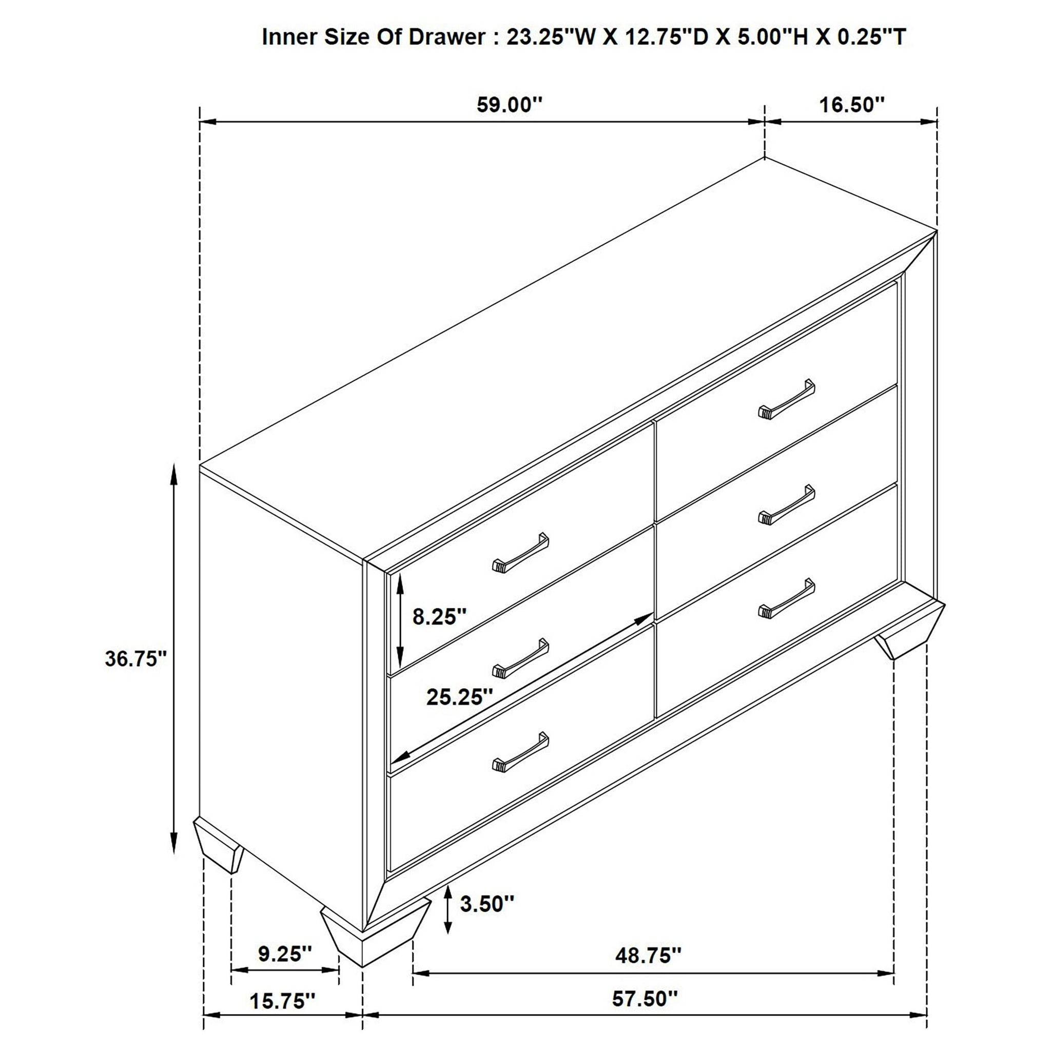 Stylish and light, the soft hues from this six-drawer dresser highlight clean lines. Featuring a stunning exposed wood grain, the washed taupe finish radiates sophistication. Mid-century modern-inspired, delicately tapered legs combine with metallic drawer pulls to create a refined sense of style. Smooth and sleek drawer fronts and sides marry to put the focus on the variations in the natural oak. Black recessed grooves around picture framed case drawer fronts adds contrast.
