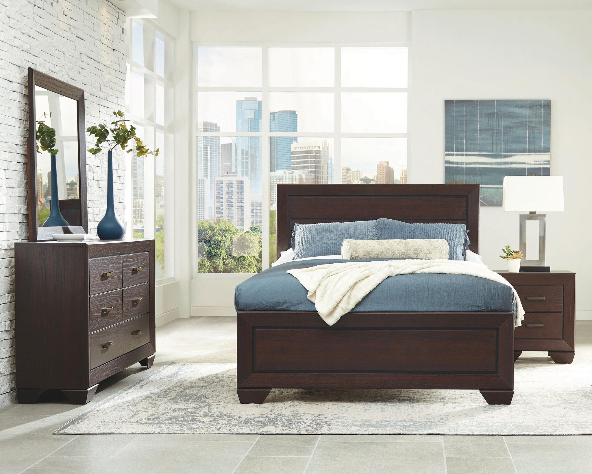 Update your sleeping quarters with graceful glamour and convenient versatility. This four-piece bedroom set boasts a transitional design that elegantly accentuates any space. Its beautiful, dark cocoa finish is livened up by the eye-catching contrast of black recessed grooves. Its case pieces feature large, spacious drawers to keep your bedroom organized with ease. Crafted for durability and quality at an exceptional value, this gorgeous set is exclusive to Coaster.