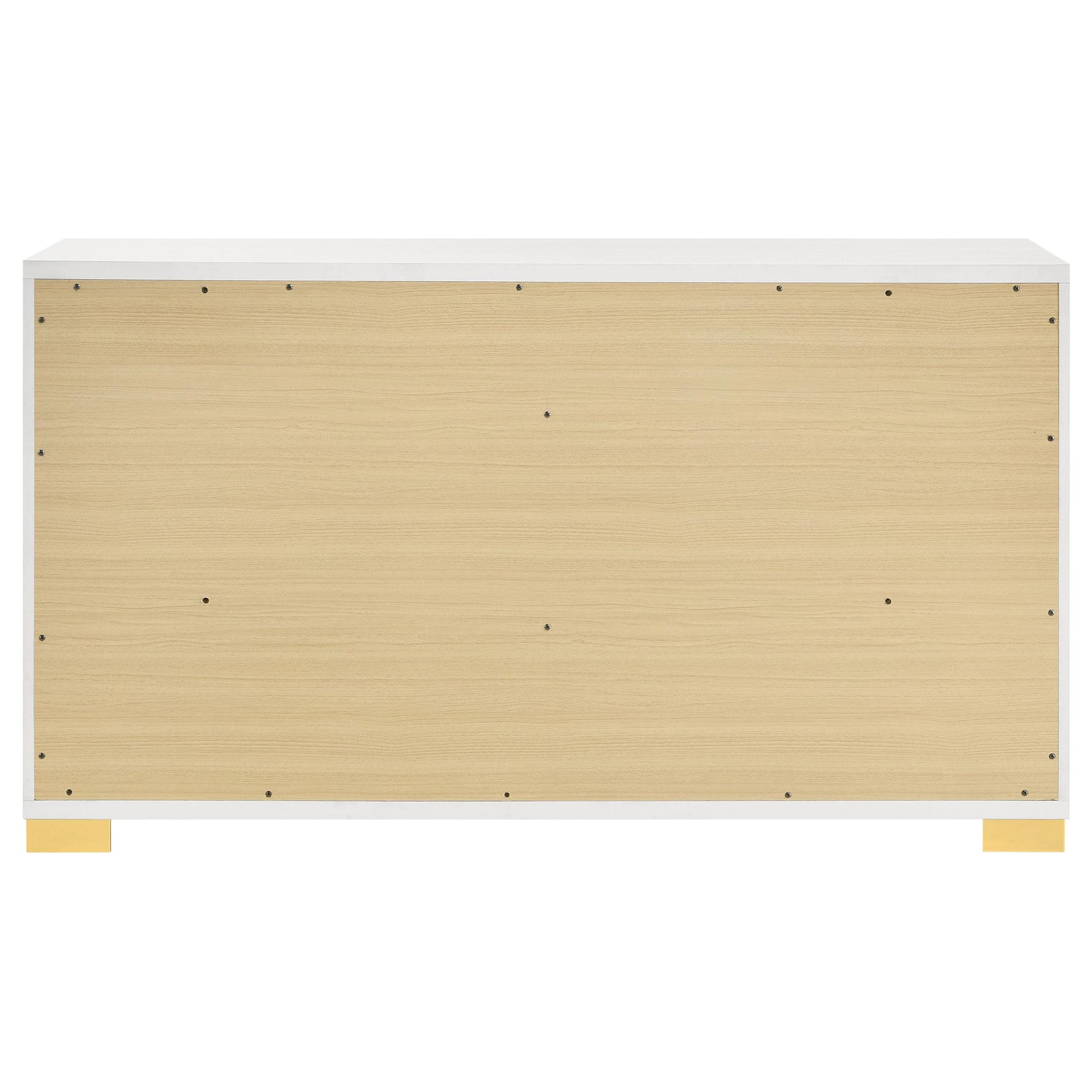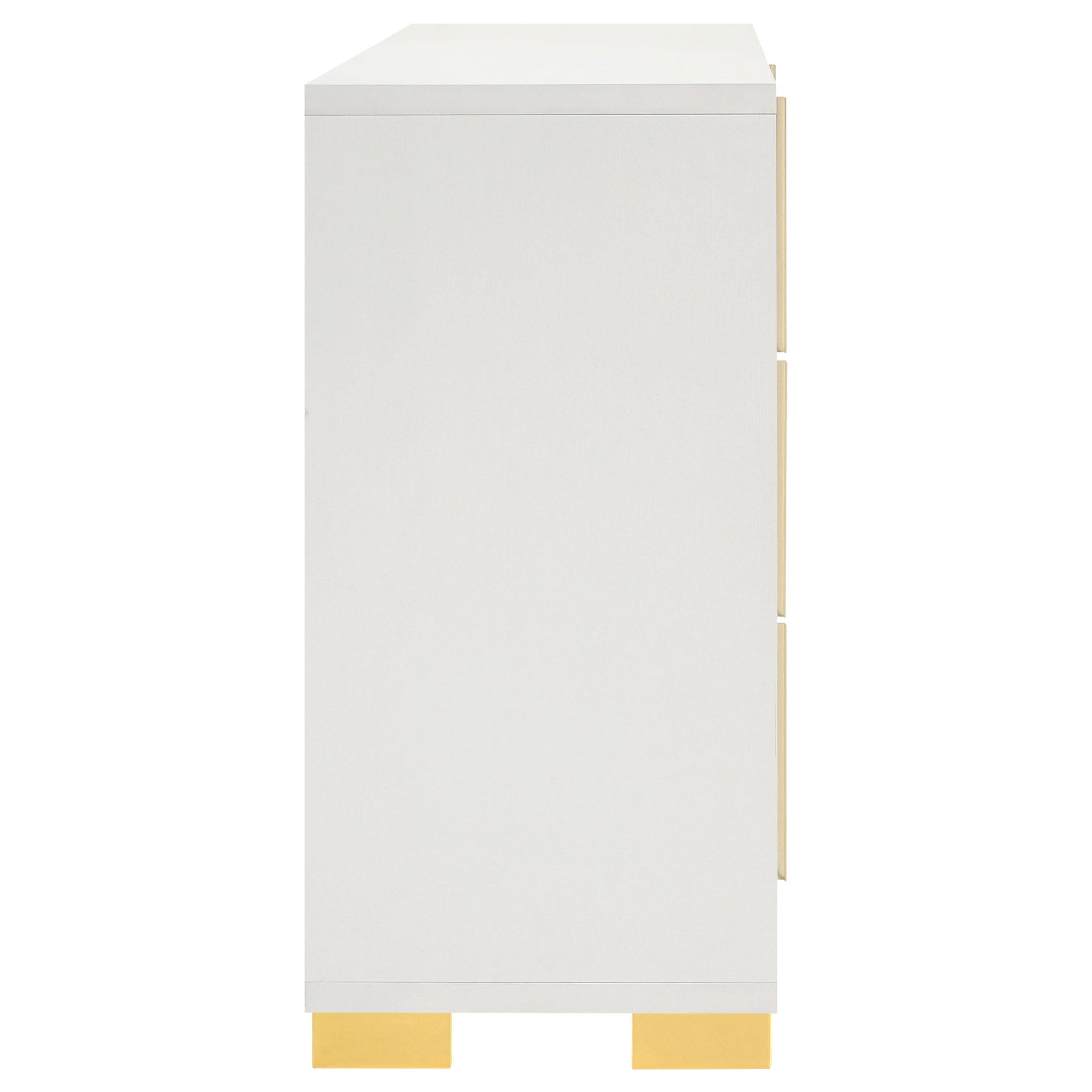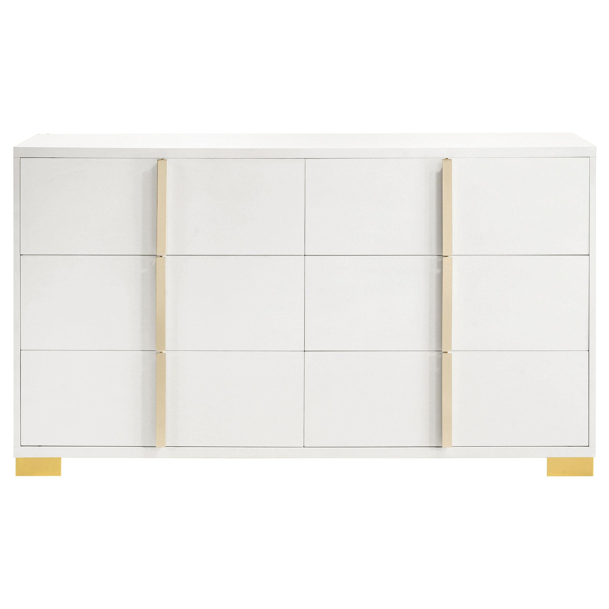 Soak up the sleek and simple yet compelling look of a six-drawer dresser with a dramatic aesthetic that changes the tone of your contemporary bedroom. Modern design details produce a chic vertical dresser with an Art Deco vibe and tons of storage space. Made of wood products, this six-drawer dresser features a versatile finish with glam accenting from gold finish metal, placed carefully to emphasize a geometric linear effect. Store incidentals and accessories in drawers operating smoothly on center metal glides. English dovetail drawer construction embellishes this dresser’s quality, as vertical gold metal drawer hardware offers a unique impact.