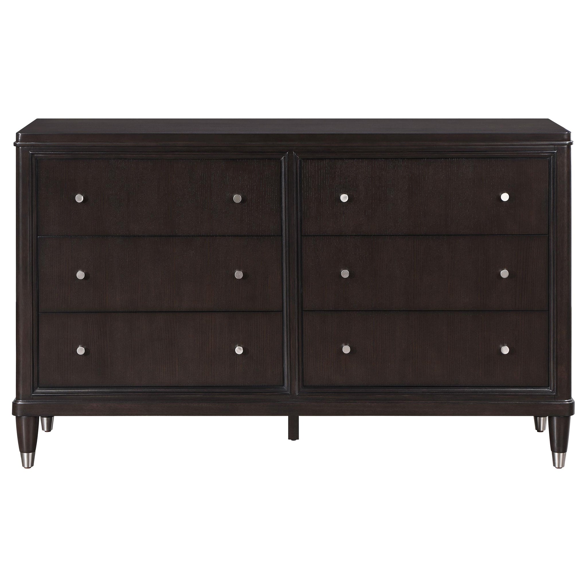 Introduce stylish storage in your bedroom with a modern six-drawer dresser. Its sleek look is accentuated in a dark brown finish, with metallic accents that add depth to tapering feel. Petite knobs decorate each drawer front as drawers offer ample storage for clothing, linens and accessories in your bedroom. The dresser offers a wide top for decor and drawers add protection with felt lining in top drawer and cedar lining and bottom drawers. Add framed photos or a metal sculptural piece to the top of the dresser to add a personal touch.
