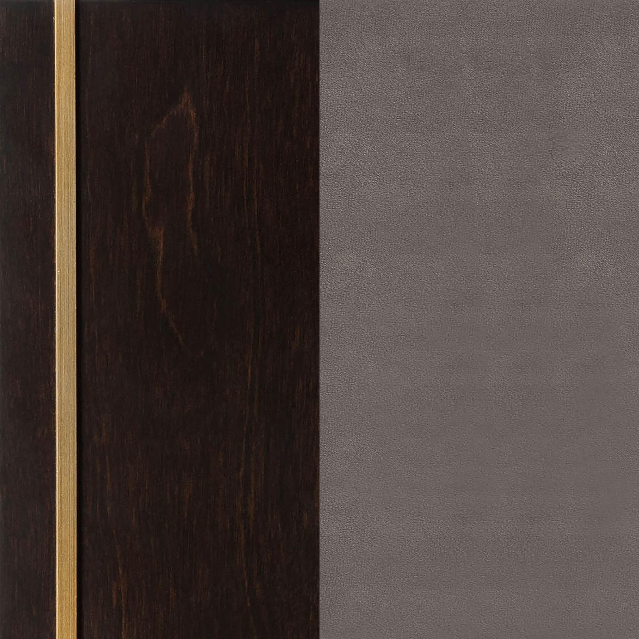 Glamorous and refined, this California king bed enhances the classic look of a master bedroom. Expertly crafted, it offers maximum support and durability. Its strong, stately silhouette is pleasingly offset by the smooth texture of soft fabric upholstery. Eye-catching, rectangular shapes adorn its base and headboard for a touch of appealing artistry. Its frame is finished in an elegant shade of smoked peppercorn to complete its elegant look.