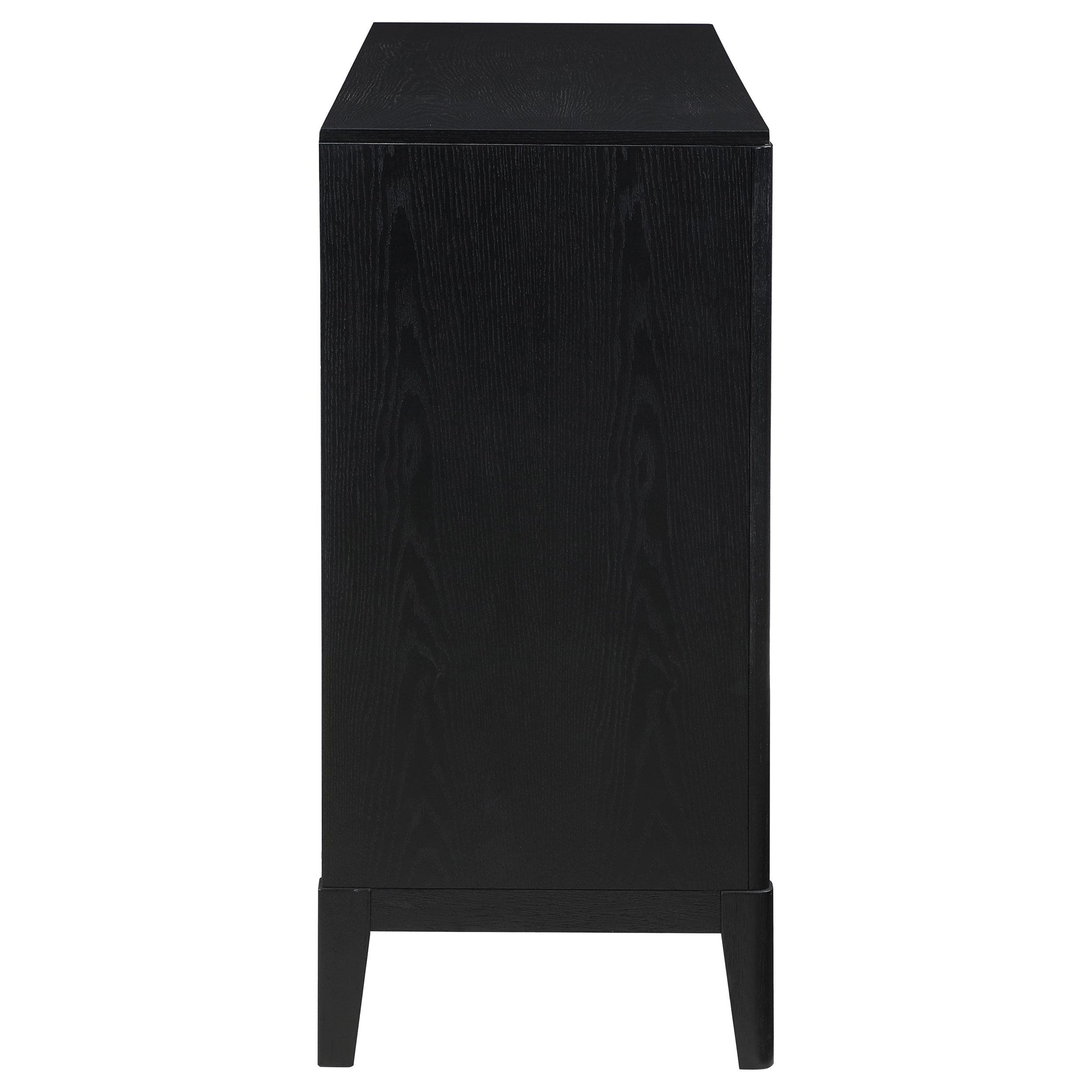 Stylish and modern, a contemporary wood dresser features a wire brushed black finish