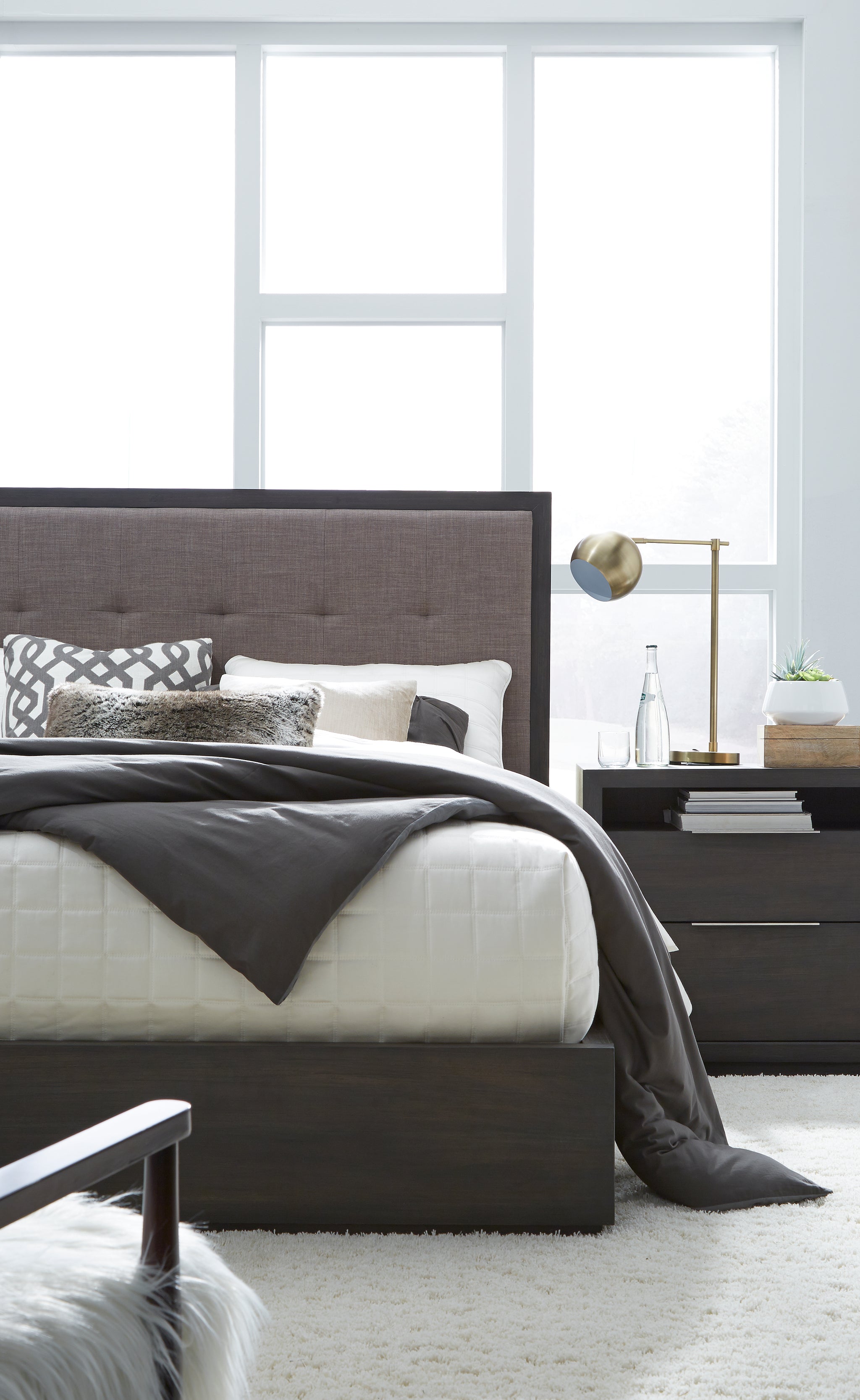 The sleekly tailored Oxford collection makes a striking first impression with bold proportions, crisp, modern lines and a weathered finish. Smartly accented with top-mounted nickel plated pulls, concealed footboard storage, and a floating plinth base. Available in Basalt Grey.