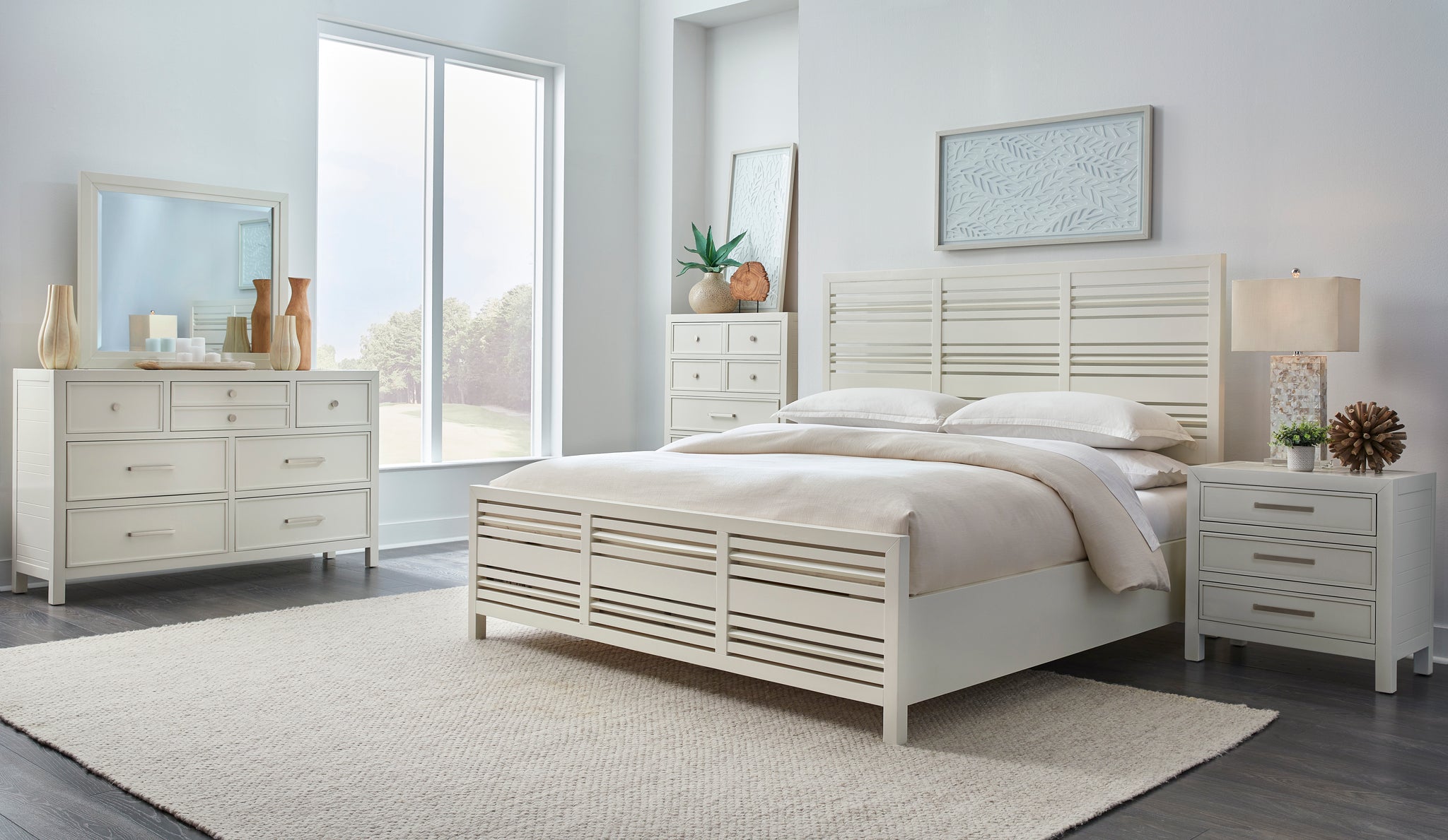 Open, airy and packed with storage, the Retreat bedroom offers a modern twist on coastal living. This bedroom set features uniquely arranged slats on the headboard and footboard to create a look that is both familiar and distinctive. Subtle traditional touches include shiplap panels and drawer face moldings to add comfort and warmth to the crisp modern lines of the silhouette.