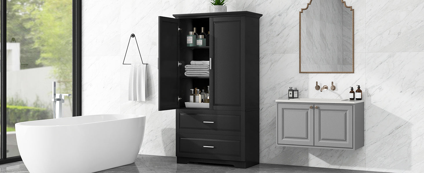 Upgrade your home organization with this tall bathroom storage cabinet, crafted for both style and practicality. The sturdy MDF frame with a smooth, water-resistant painted finish ensures durability and easy maintenance, while metal hardware and drawer slides add lasting strength.