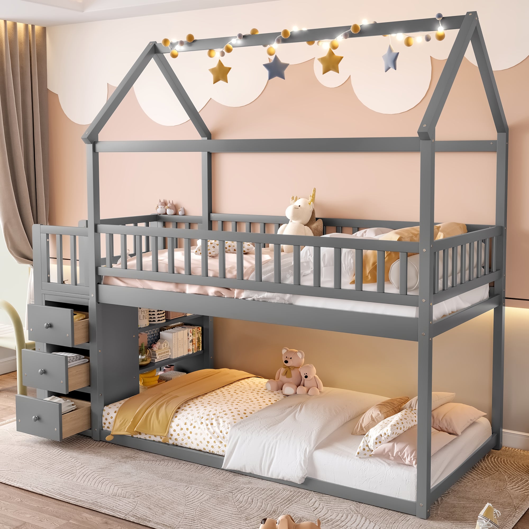- [Storage Functions and Space-Saving]: The storage shelves and drawers provide an organized haven for books, toys, and other items to stock that not only make the most of space but also help to develop kids' habit of storage. Moreover, this bunk bed has a twin-size bed on the top and a twin-size bed on the bottom or as a playing area, which saves space to the greatest extent. Our bunk bed promotes both comfort and charm.