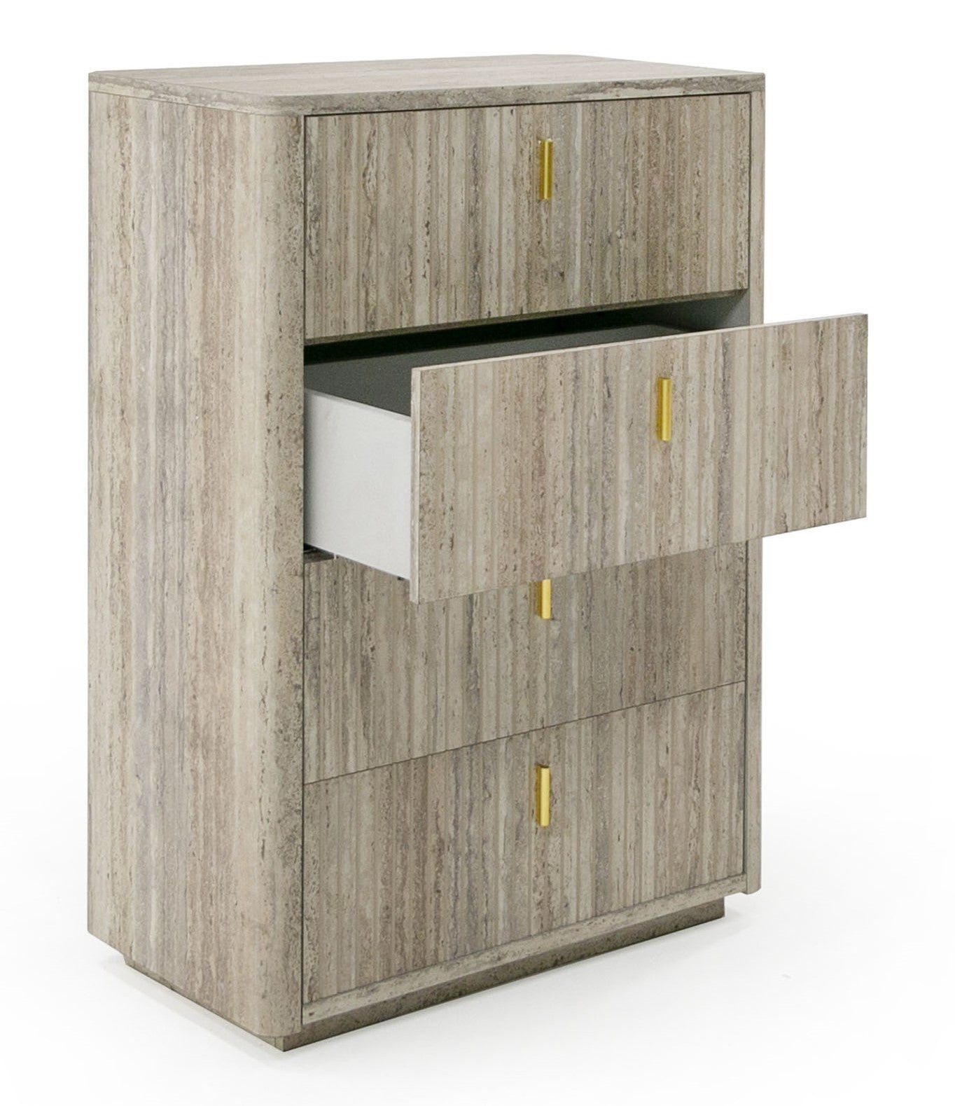 The Roma Chest comes from our new Roma Bedroom collection! This vertical chest features four drawers with soft/self closing drawers and elegant golden metal handles. The surface of the piece is a faux travertine laminate finish all over. The Roma Chest combines excellent quality material and suburb design that makes it a stunner in any bedroom space. The Roma collection also includes a dresser, mirror and nightstand as well as matching living, dining and office furniture!
