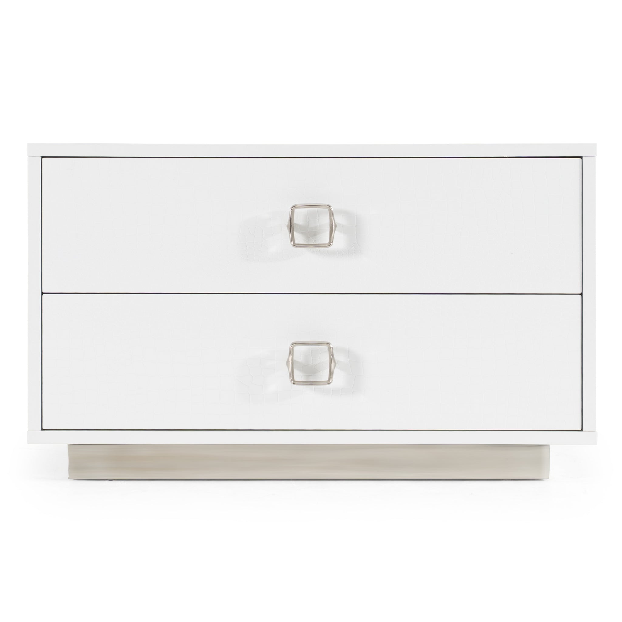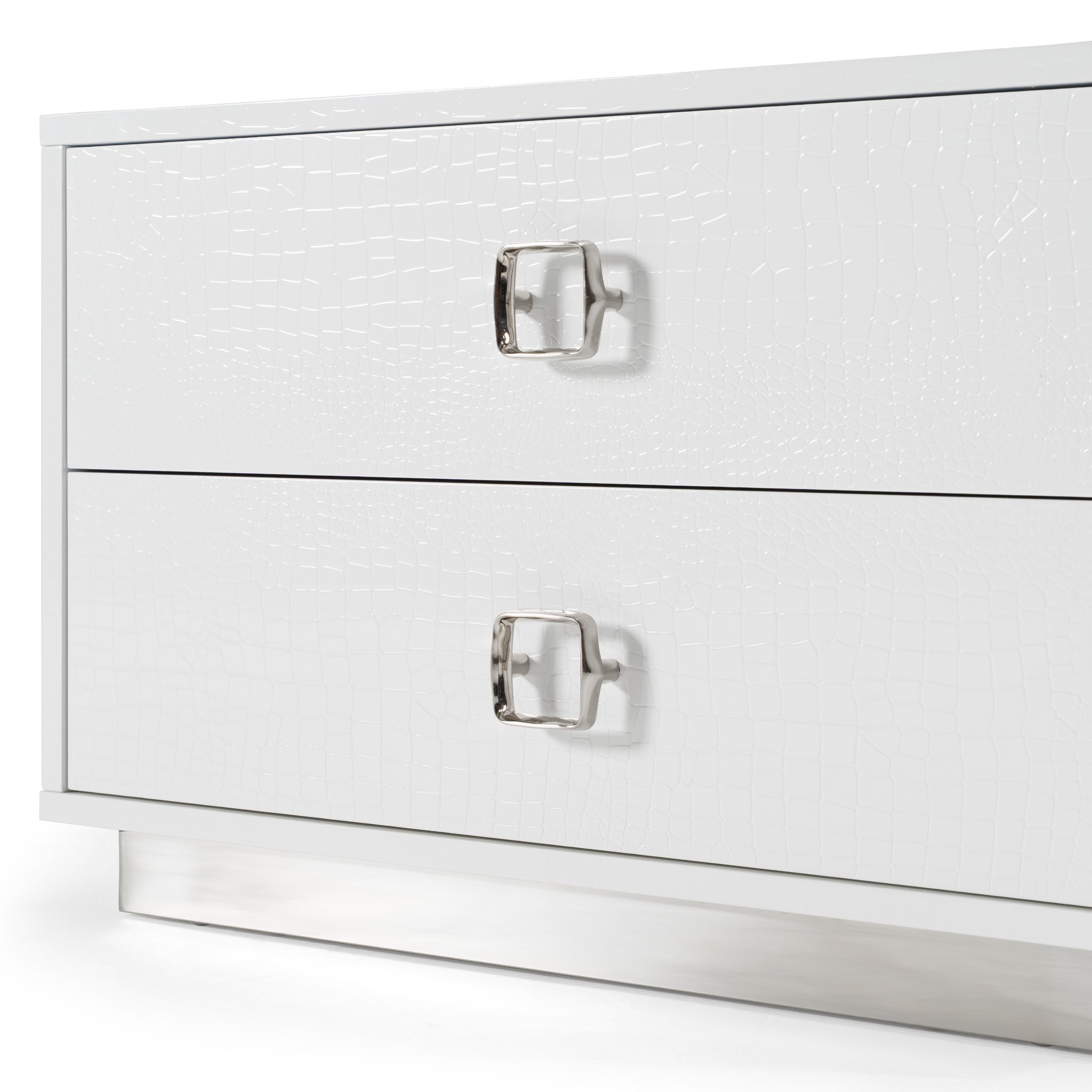 The stark white high gloss of the Victoria Nightstand is striking and impressive. The textured crocodile style finish is unique and stylish. Paired with the silver drawer pulls and base, this is a truly elegant piece. Two soft closing drawers are functional and beautiful. Pair with the Victoria Dresser and Chest for a complete set.