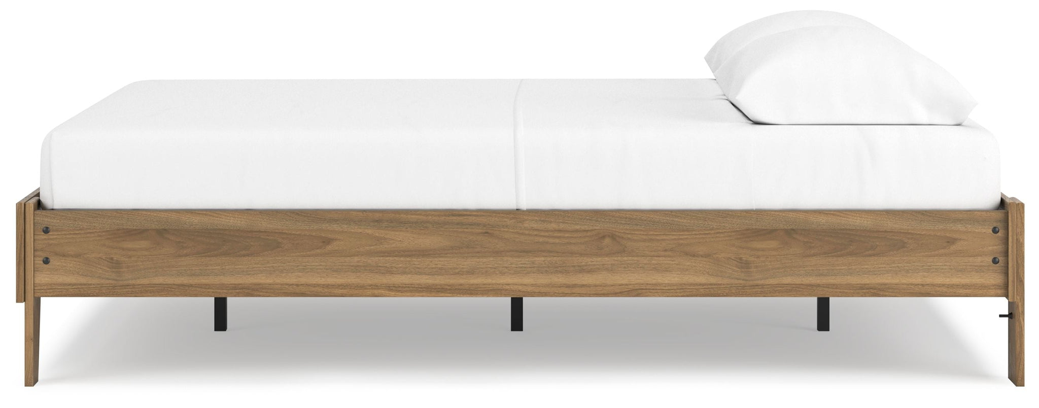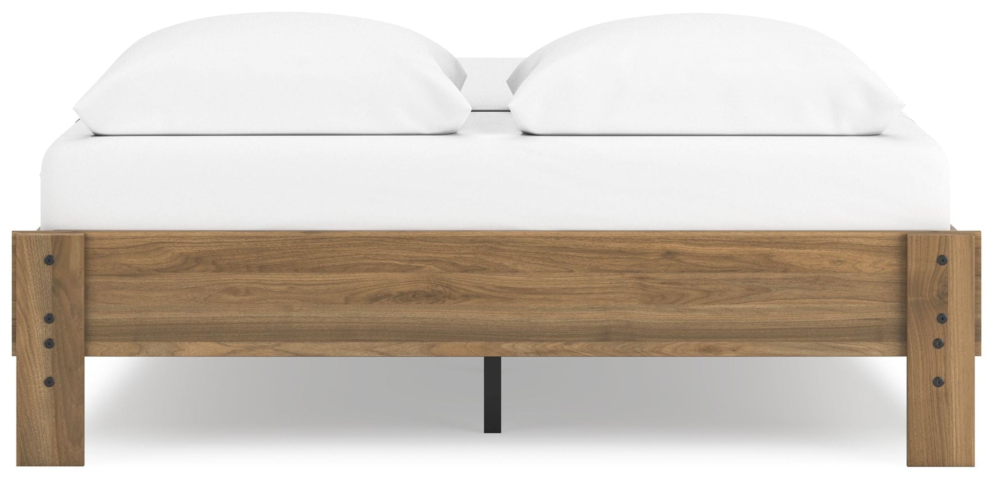 Queen platform bed (does not include headboard)Made with engineered wood (MDF/particleboard/plywood) and decorative laminate for the right balance of affordability and durabilityRich honey brown finish over replicated walnut grain with authentic touchDecorative laminate replicates natural or man-made material surfaces with consistent color, pattern and textureBed does not require a foundation/box springMattress available, sold separatelyAssembly required