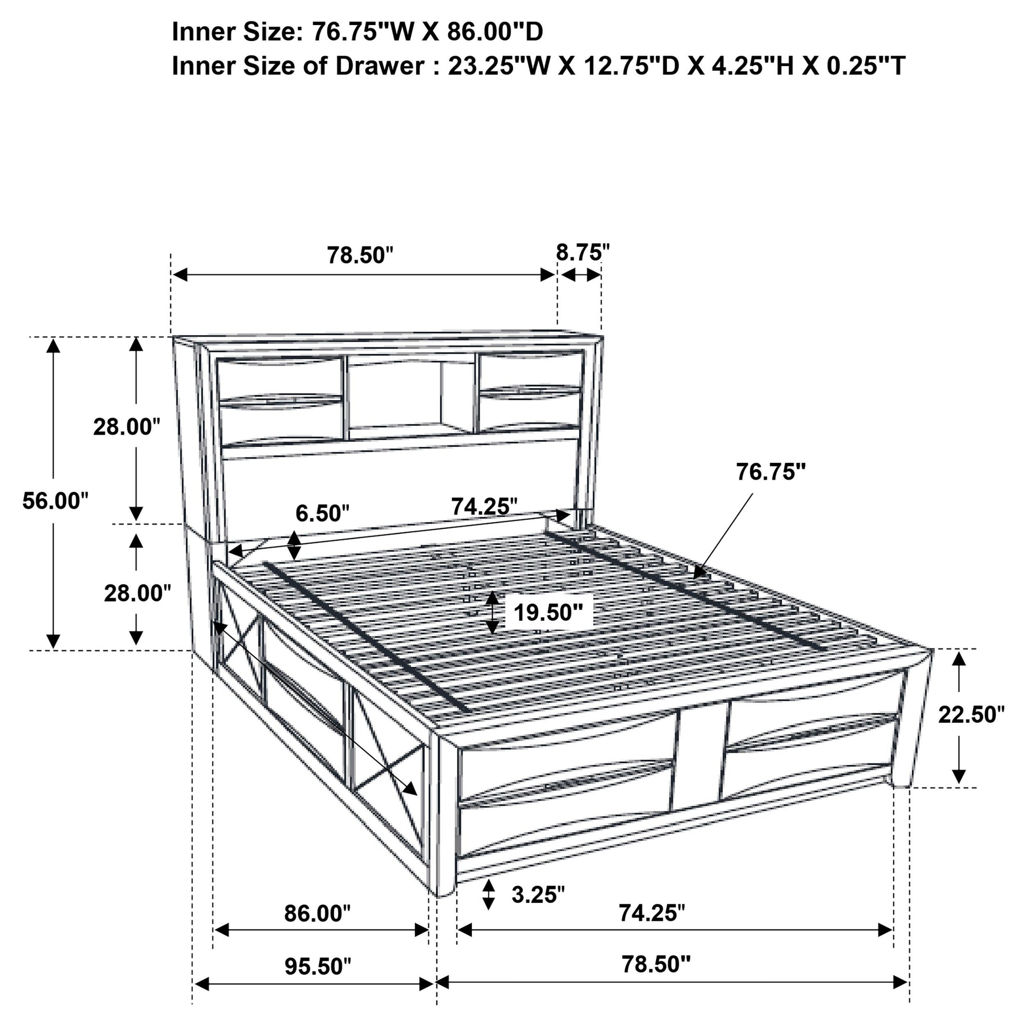 Update a bedroom with the open and geometric details from this California king storage bed. Add depth with the chamfered edge drawer fronts that line the simple silhouette. The headboard is full of clean lines and features drop down compartments and a shelf. making it perfect for a primary suite of any size. The frame and sleek black finish from this transitional design look great in any modern space. The footboard features four drawers while the right side has a drop down compartments, perfect for storing linens and clothing.