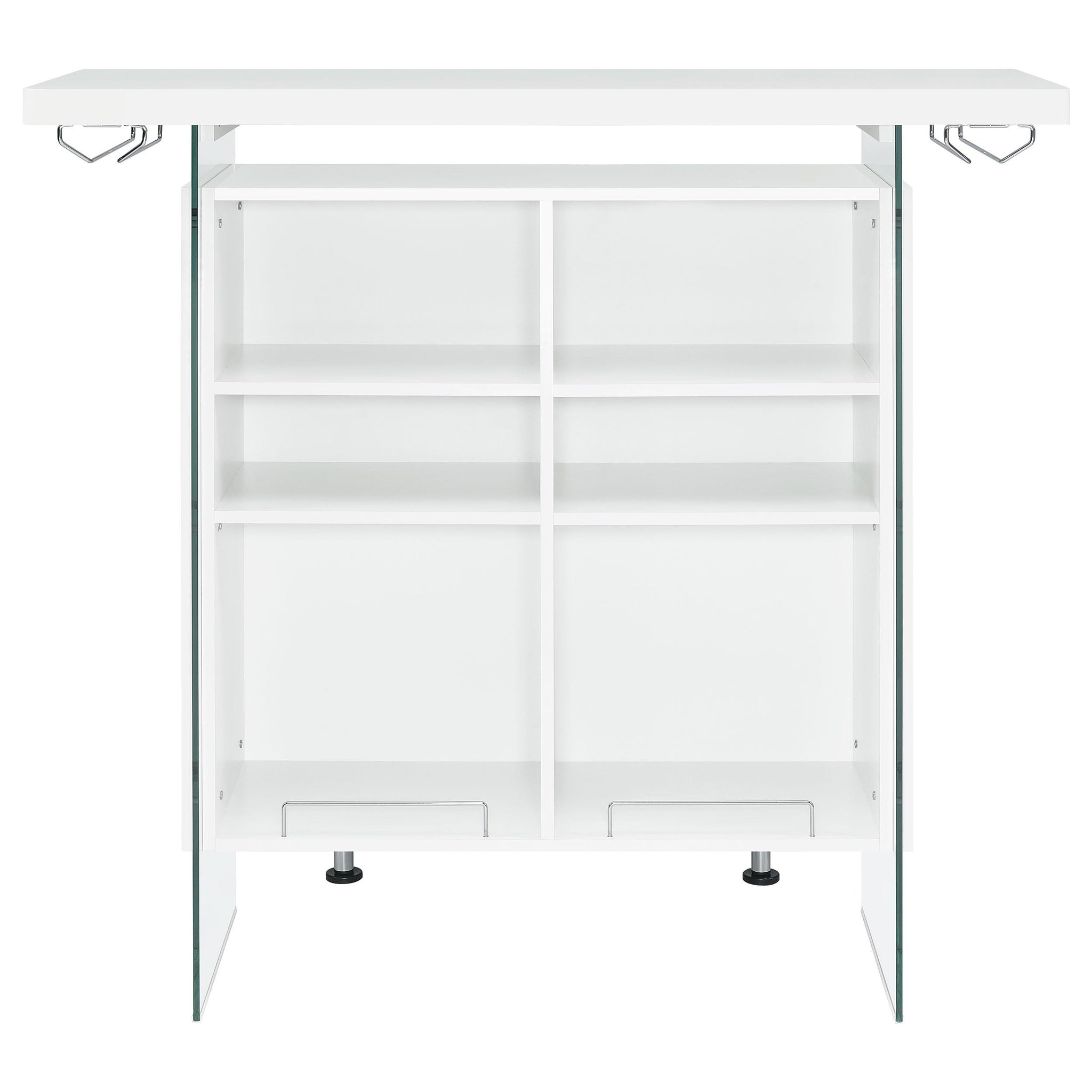 Elevate a multipurpose living room with this modern bar unit. A neutral finish, accented with polished chrome metal accents offers a striking design contrast. Supported and flanked by clear tempered glass side panels, this bar unit boasts ultra-modern elements as well for a dramatic feel. Compact yet highly functional, this bar unit also features ample storage space with six built-in open shelves for storing bottles, serving pieces and other mixologist must-haves. Tucked beneath the bar top along each side is a stemware rack for wine glasses and more.