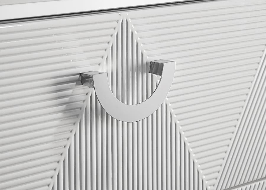 With its sculptural drawer fronts and crisp white high gloss finish, this nightstand brings a fresh, modern edge to the bedroom. Two spacious drawers feature dimensional geometric textures and sleek chrome-finished pulls, while the top drawer is lined in black felt for added refinement. Built-in USB-A and USB-C ports on the back offer convenient charging access. Metal extension glides and polished surface details complete this bold yet functional bedside table.