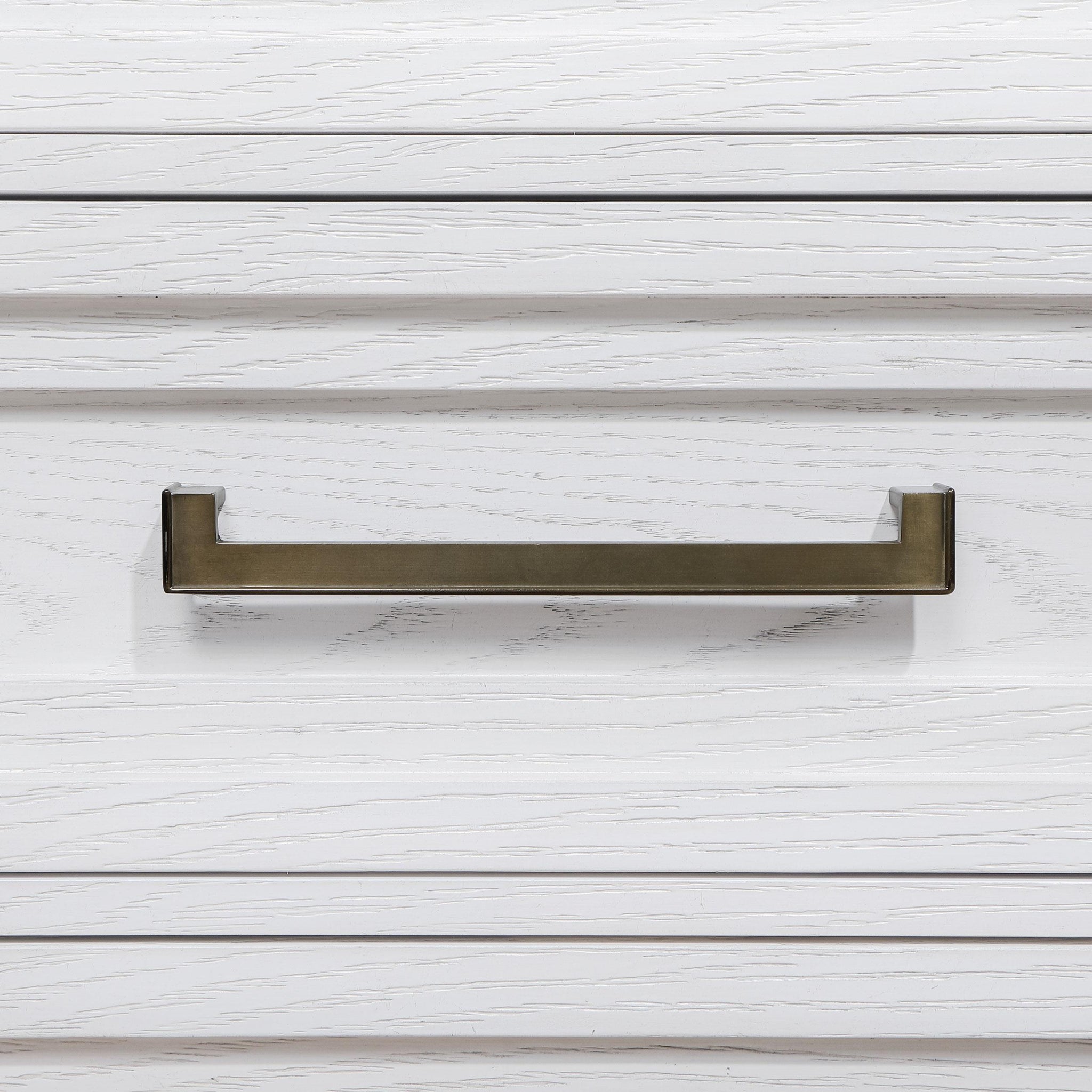 Light distressing offers depth and dimensionality to a modern six-drawer dresser. Perfect for clothing and other accessories, it features a double profile with three drawers on each side. A white finish allows wood grain details to show through, creating organic character and texture. Drawer fronts are a stepped design that adds artistry, with long antique brass toned pulls that add contrasting depth. use the wide top for personal effects like a jewelry box or valet and framed photos.