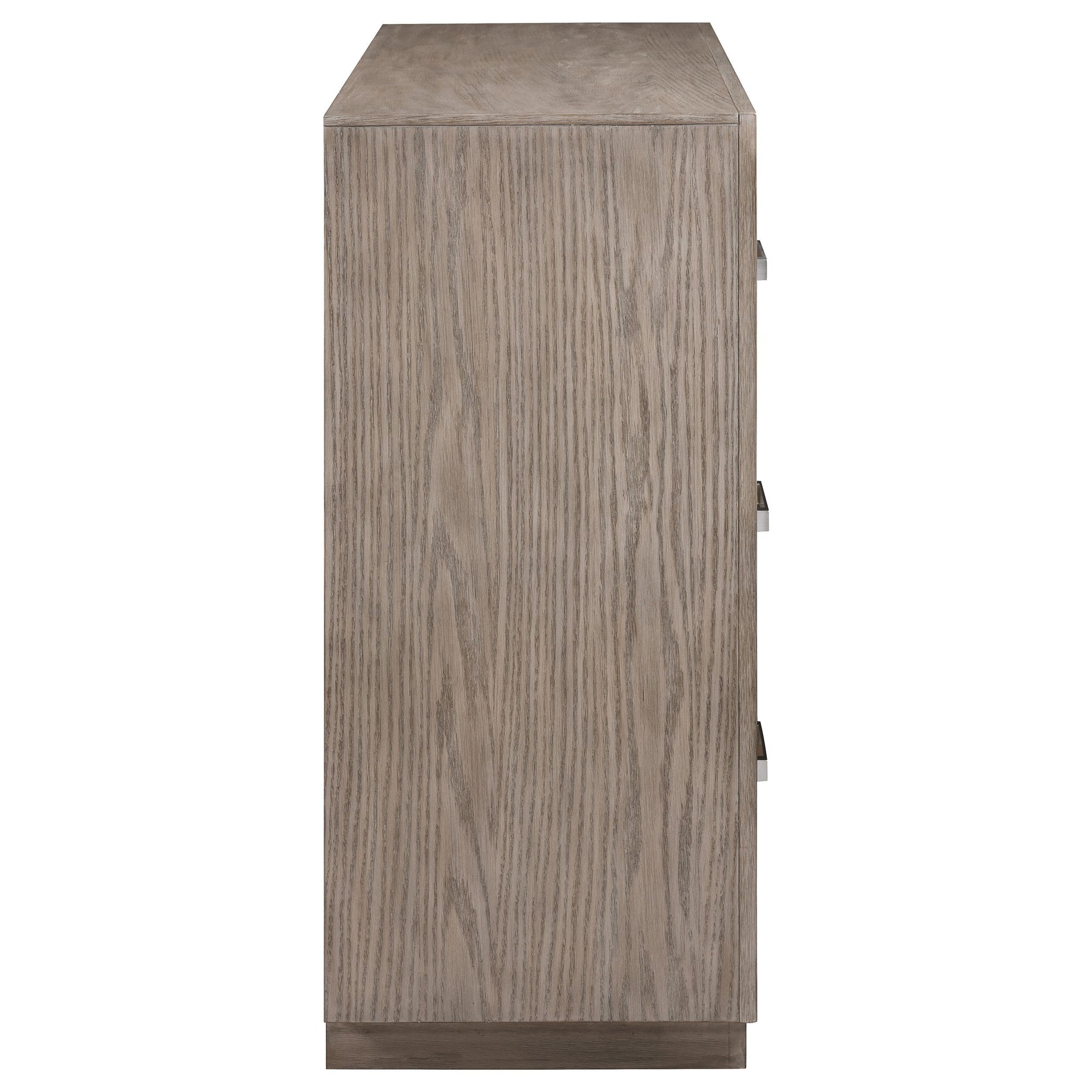 Enjoy the roomy storage and understated character of a modern six-drawer dresser. Its a fresh, understated design that showcases a wide top and recessed base that pair to deliver a timeless look. The dresser shows off wood grain details in a neutral barley brown finish, delivering stylish flair that complements in any setting. Each drawer is equally sized for easy storage and organization. Chrome finish bar pulls add a touch of contrast and textural appeal.