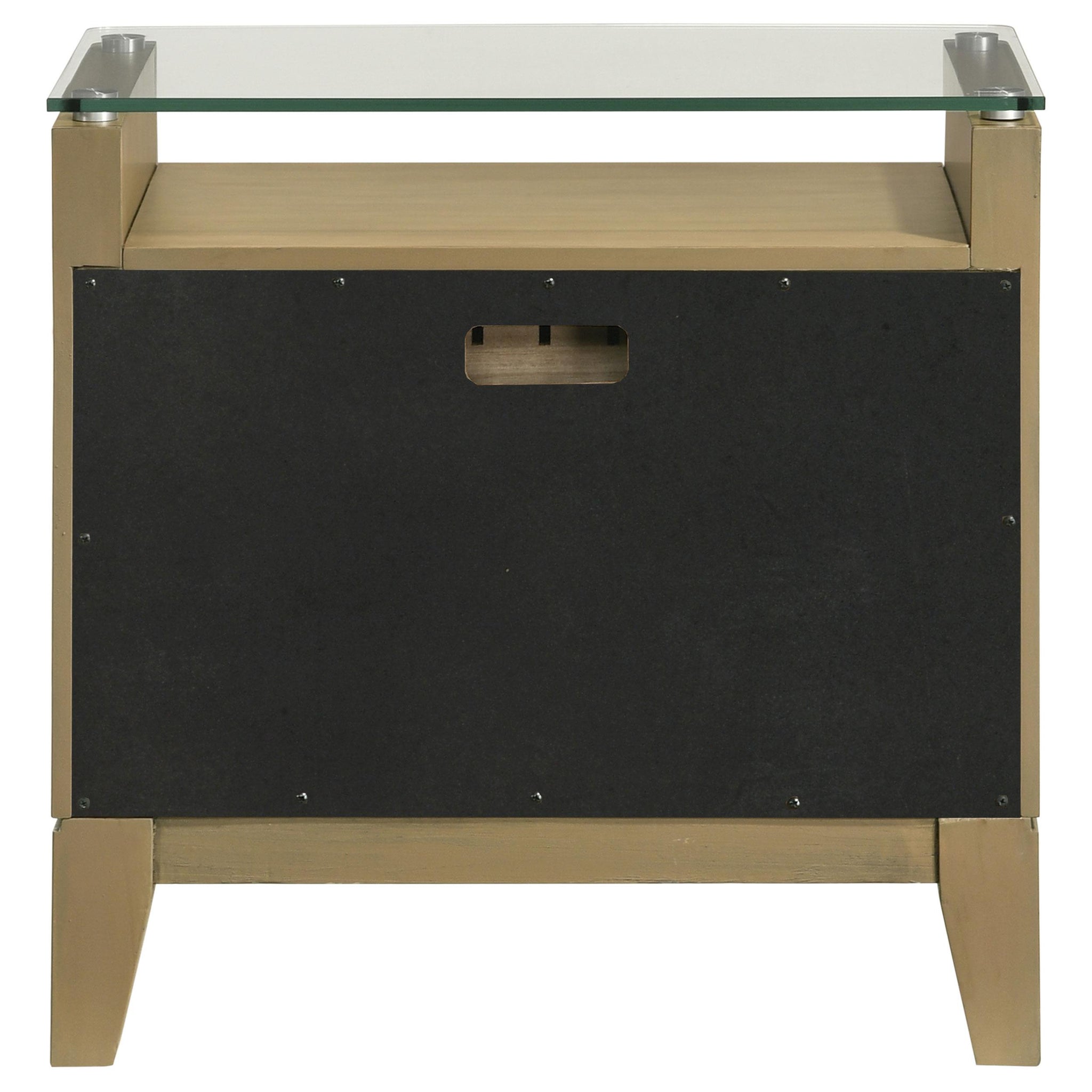 This nightstand is a perfect blend of style and functionality, featuring a natural pine finish that exudes a warm and inviting aura. Its top drawer offers cord management access, ideal for recharging devices conveniently. The pieces softly curved fronts and tempered glass top add a modern twist to its classic design. Square tapered legs enhance its sturdy yet elegant structure, making it a versatile addition to any bedroom. Complemented by antique nickel hardware, this nightstand is both practical and stylish.