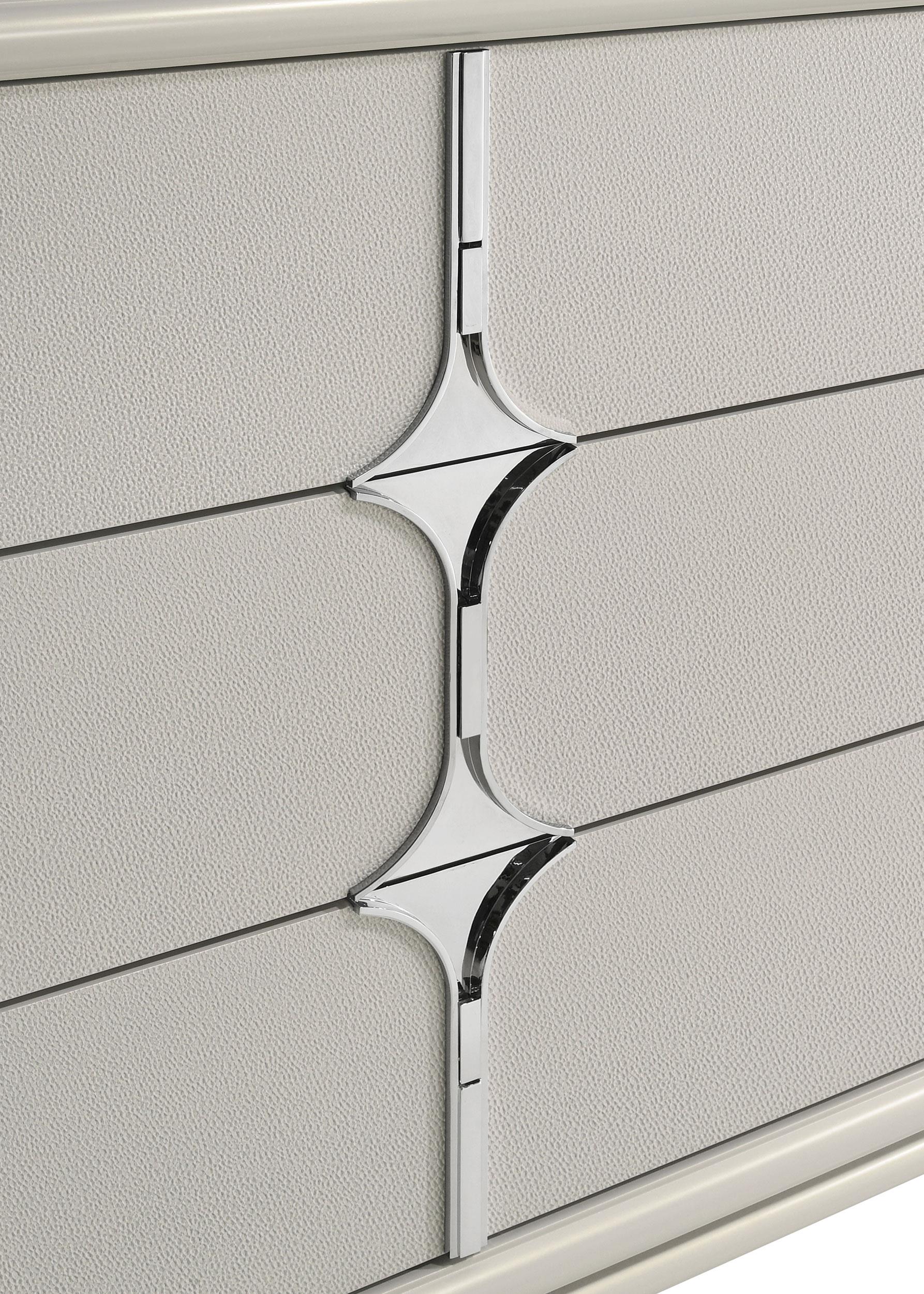 Redefine elegance in your bedroom with this sophisticated dresser and mirror set. The 6-drawer dresser, adorned with a pearl white finish and diamond star drawer fronts, exudes contemporary charm, while the mirror’s shaped beveled glass and touch LED lighting add a touch of modern luxury. Both pieces are accented with polished chrome and mirror framing, creating a cohesive and stylish look. The dresser offers ample storage with a secret jewelry tray for added convenience. This set effortlessly combines beauty and functionality, making it a standout addition to any bedroom.