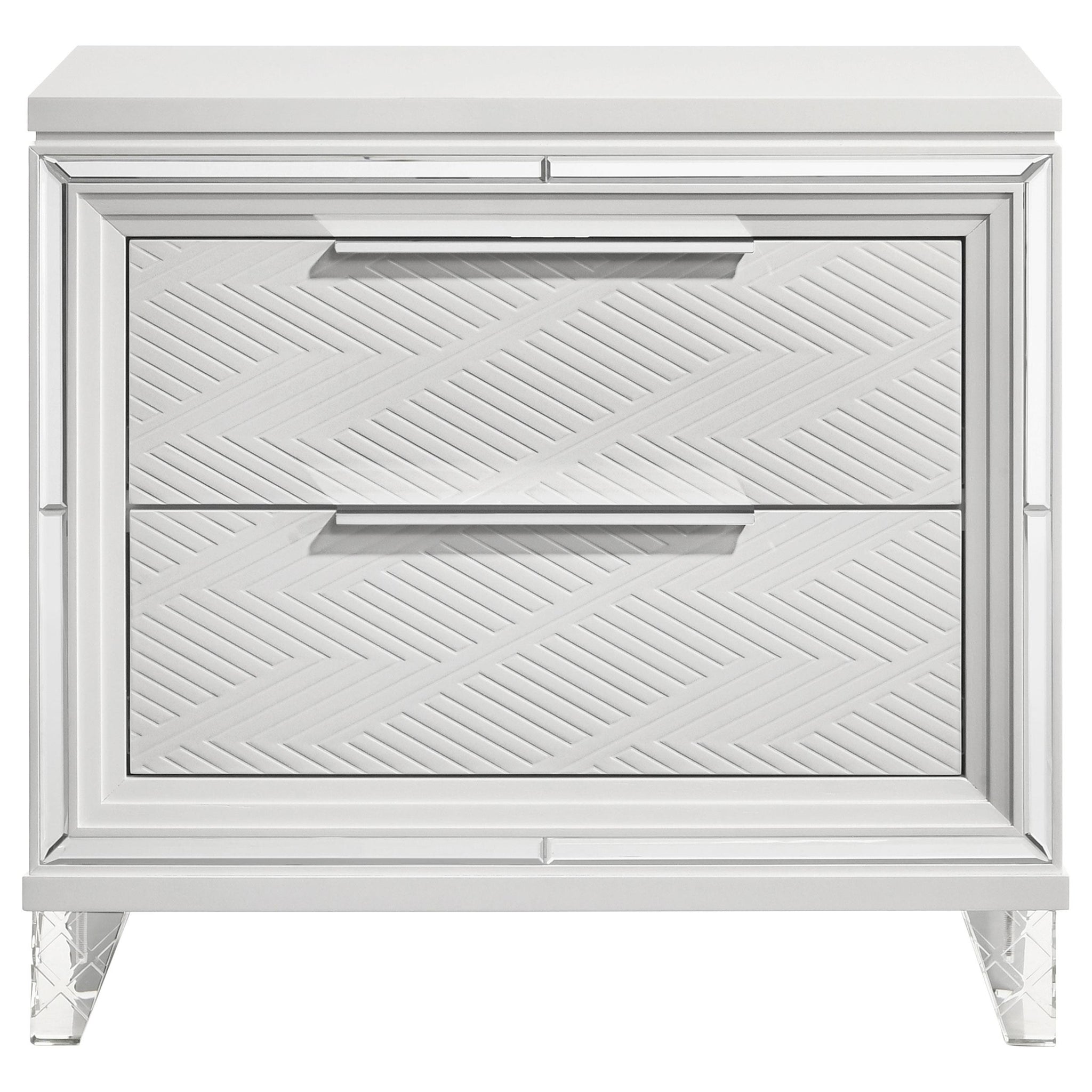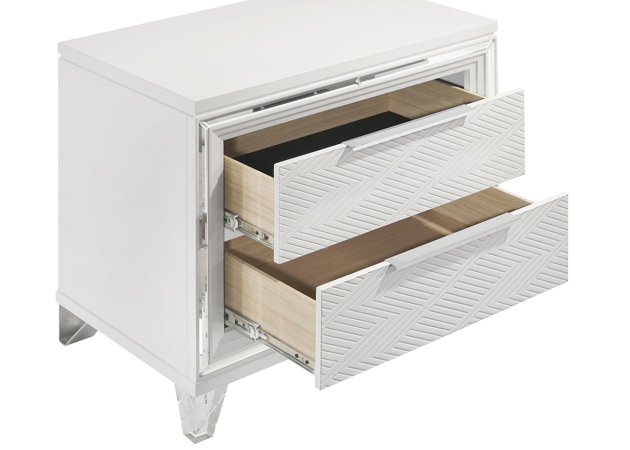 Complete your bedroom ensemble with this elegant 2-drawer nightstand, designed with a modern Italian aesthetic. The white finish, accented with mirror framing and polished chrome metal hardware, creates a striking look. Featuring picture framed recessed panels with an embossed herringbone graphic pattern, this nightstand offers both style and functionality. The top drawer includes cord management access, making it perfect for your rechargeable devices. Crafted from Asian hardwood, MDF, and mirror, this nightstand is a luxurious addition to any bedroom.