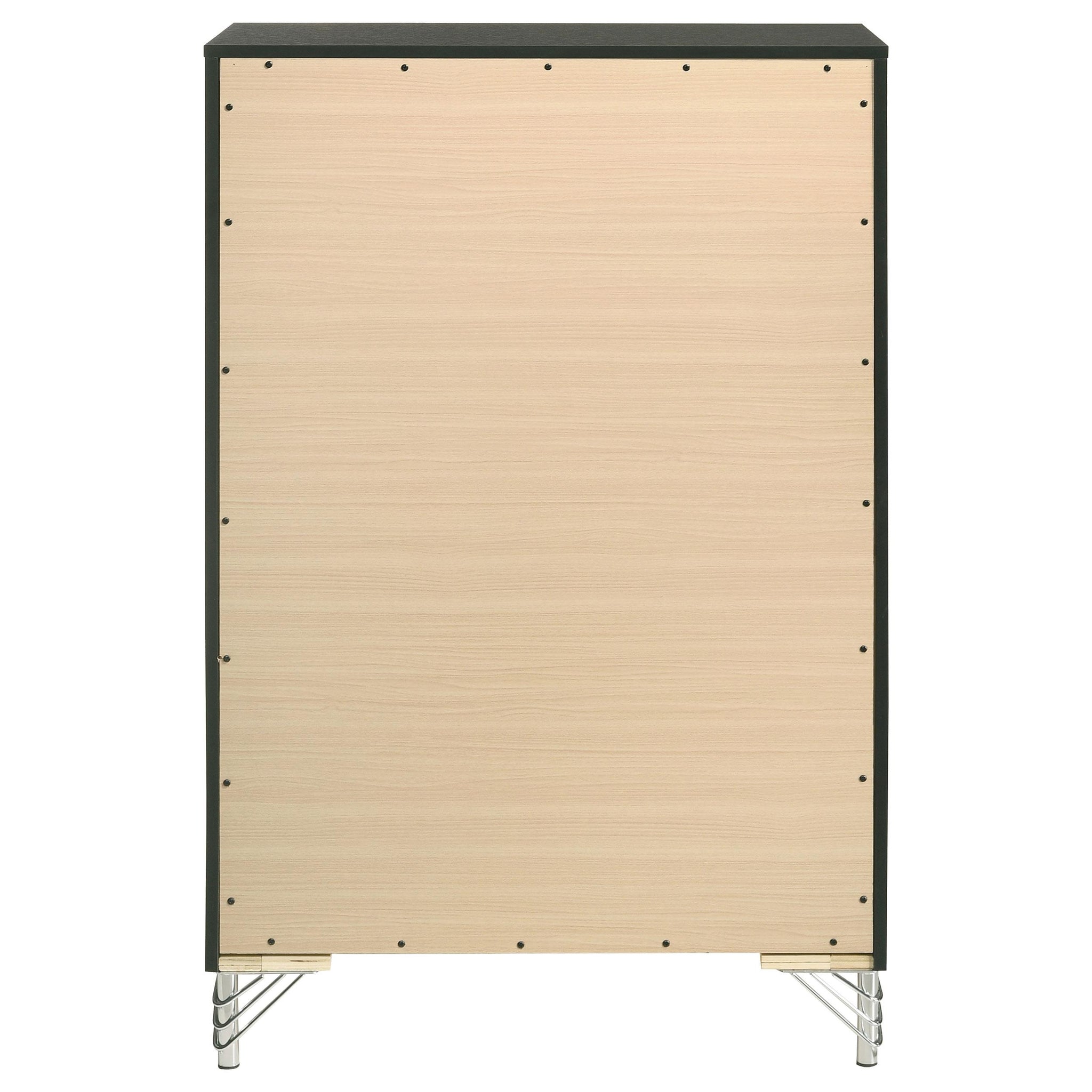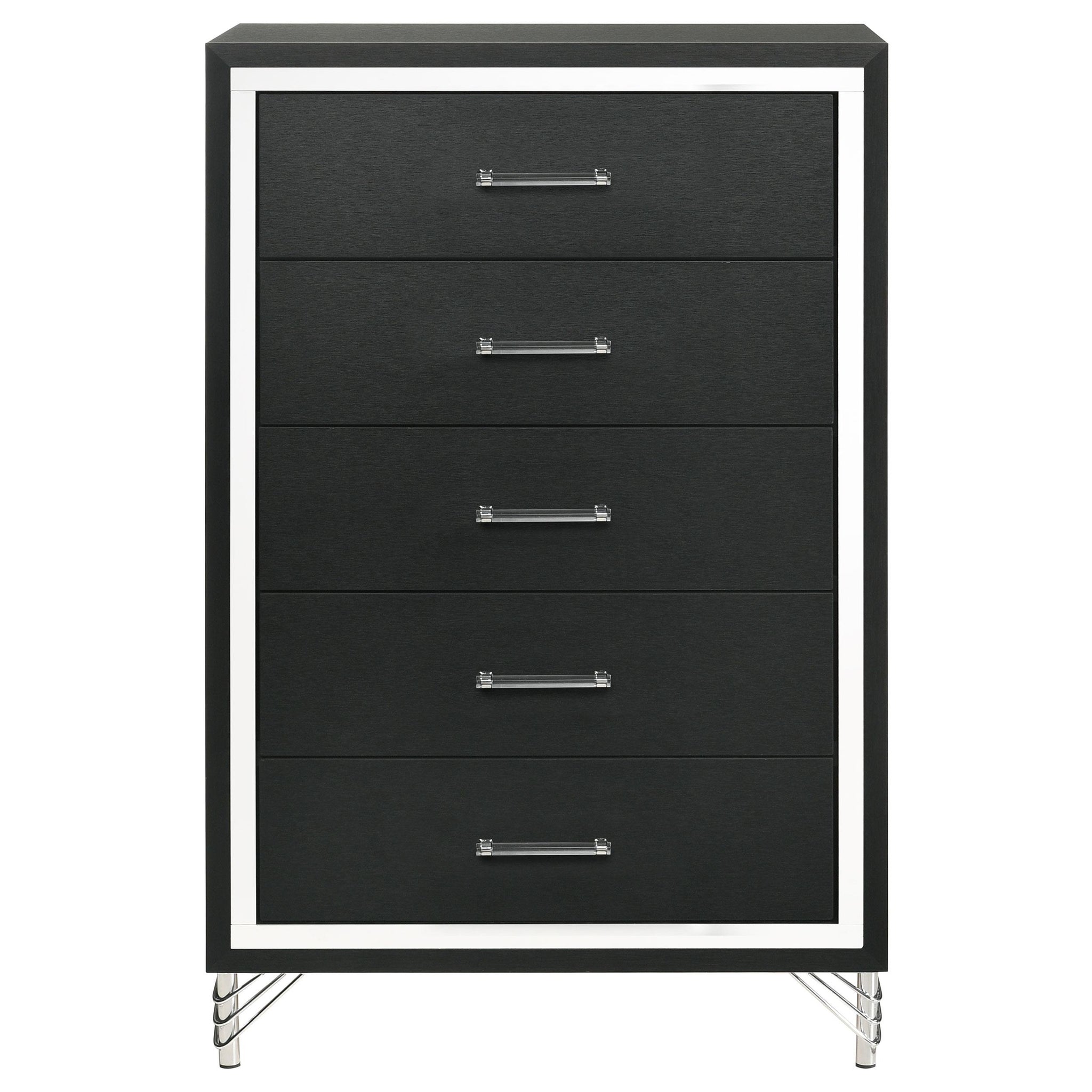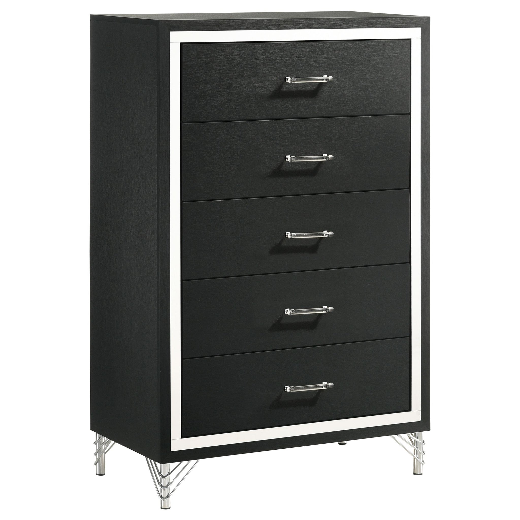 Inspired vintage touches create a refined sensibility for a modern five-drawer chest. Its tall, compact profile is ideal for a dressing area, offering plenty of storage with five roomy drawers that host everything from clothing and accessories to linens and other personal effects. The chest shows off a bold black finish, complete with gleaming chrome trim that adds coolness and elegance. Its long bar drawer pulls add character, while hair pin inspired legs bring retro glamour and sophistication. Add decor to the top for a personal touch in your bedroom.