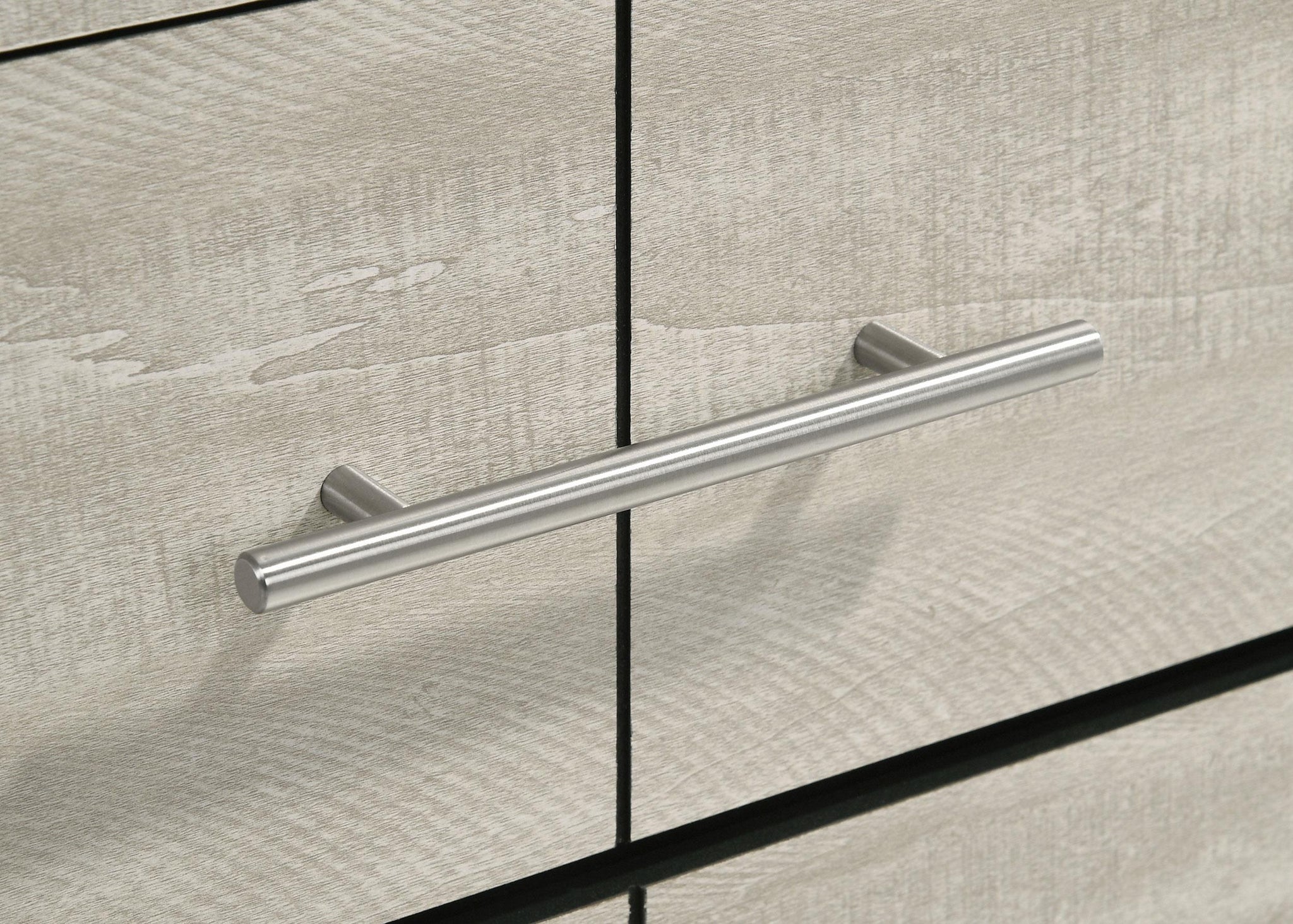 This contemporary two-drawer nightstand brings a chic blend of rustic and modern design to your bedside. Crafted with a rustic cream finish over rough-sawn, white-washed engineered paper veneer, it exudes a warm, textured appeal. Extra-wide polished nickel handles offer a sleek contrast to the rustic tones, adding a touch of sophistication. Built with engineered wood and featuring durable English dovetail joinery and Center metal glides, this nightstand is as functional as it is stylish, providing ample storage in a compact, modern silhouette.