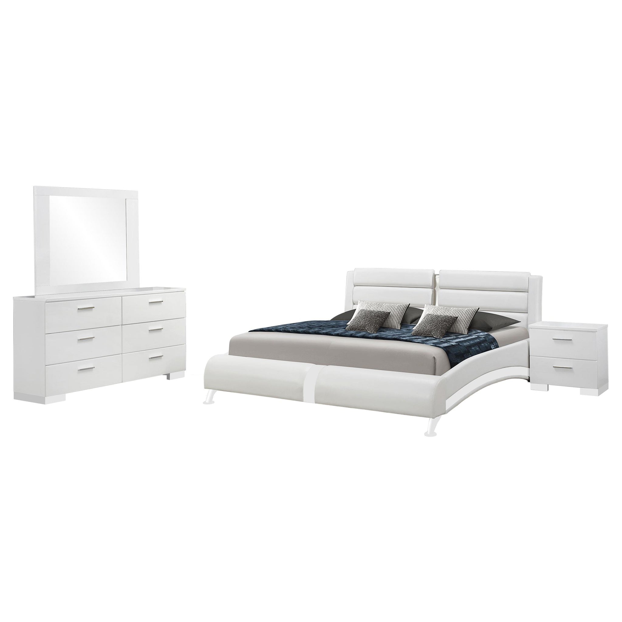 Sleek and contemporary, this four-piece bedroom set exudes modern glamour. Its white, polyurethane coating is pleasingly polished to a gorgeous, glossy finish. The mirror and case pieces are simple and straight. The sturdy bed frame boasts a boldly curved shape. Gleaming, chrome hardware completes its design with even more brilliant shine.