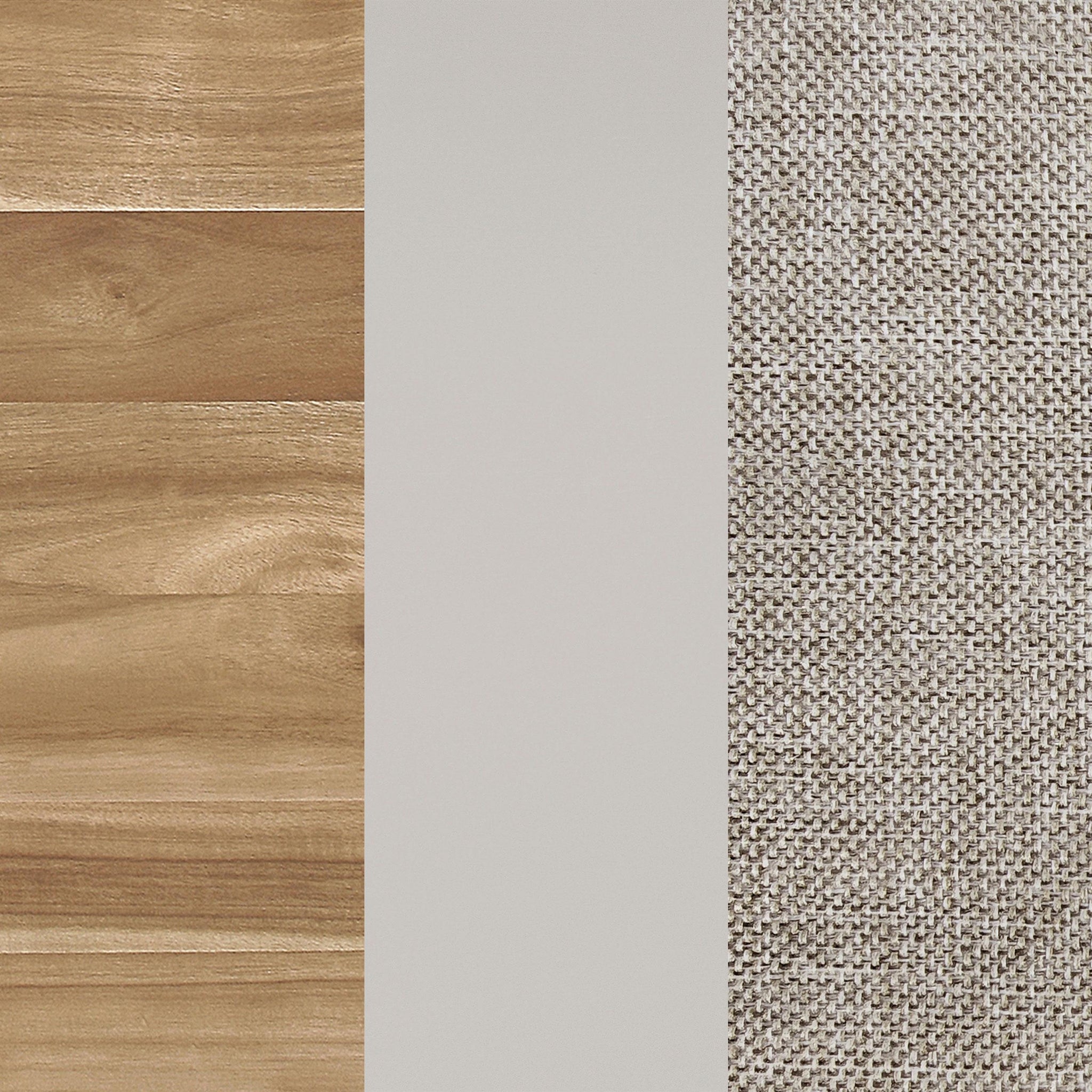 Table features a two-tone finish of natural acacia wood tabletop and white base, splayed legs, and tapered apron