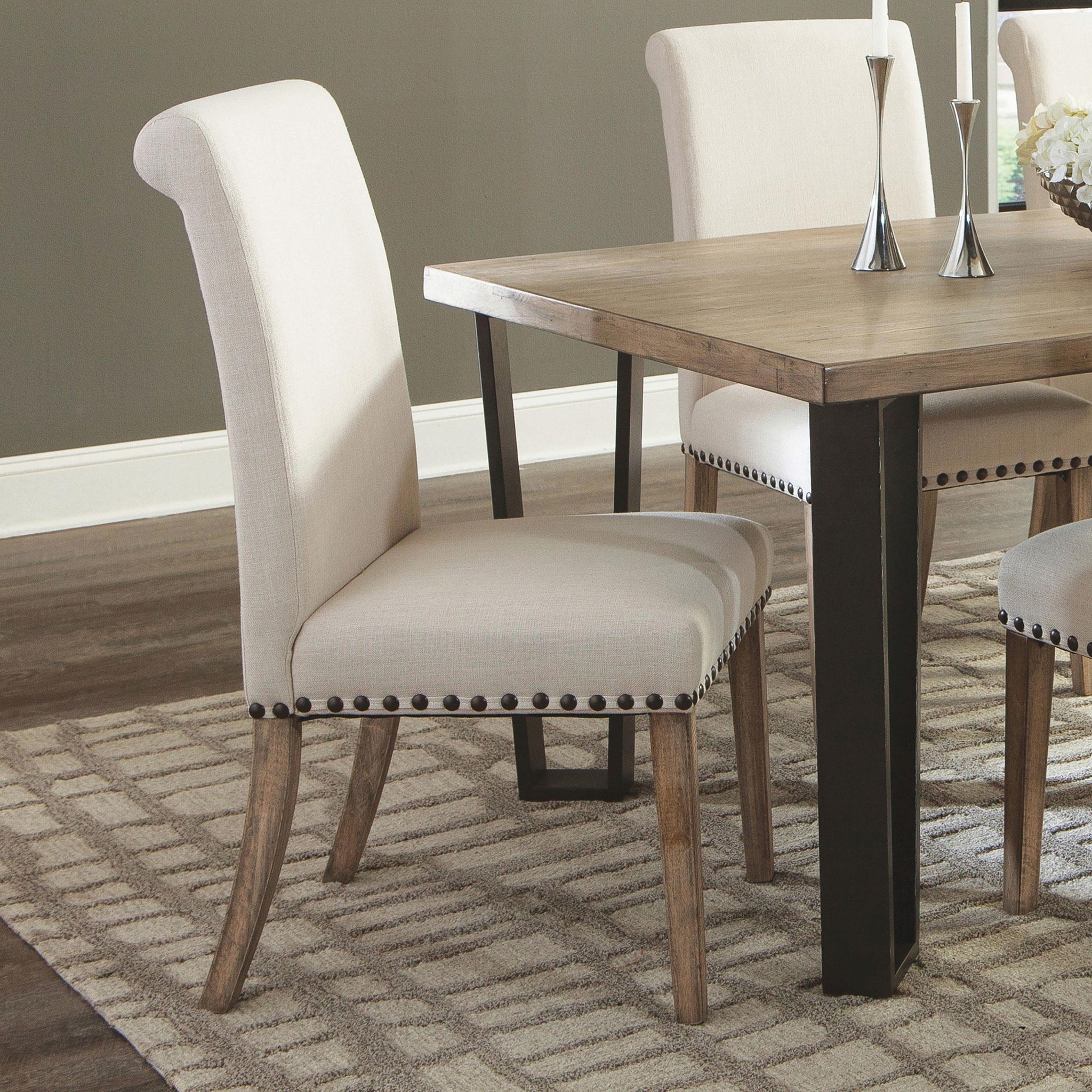 Appreciate the sophisticated look of a tall silhouette with fresh, inspiring style. This dining chair offers a versatile look that blends well with glass, wood, or metal tables. Transitional in motif, it combines invigorating modern touches with classic elements. A neutral upholstered wrap generates light, airy ambiance. Charming nail heads line the bottom of its seat edge, and narrow tapered legs with a neutral finish balance a stylish palette.