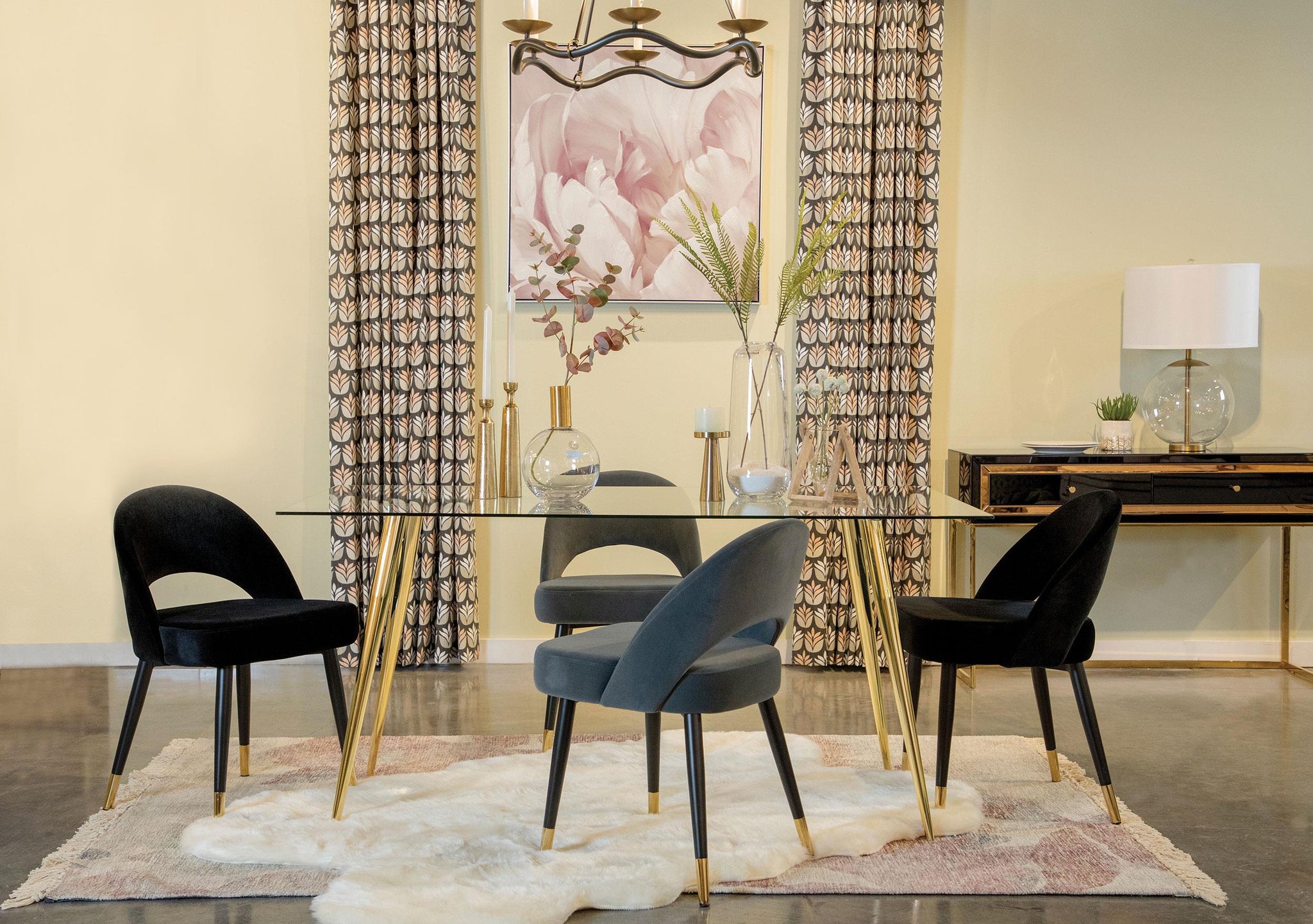 Super stylish with a mid-century modern flair, this dining table is as sleek as they come. Clean lines and an open and airy design offer a transitional twist to this dining table, making it a stunning artistic piece. A rectangular glass tabletop floats elegantly above, supported by flared and tapered legs in a lustrous metal finish add a shimmer to the space. Choose between warm or cool metal tones to tie together your existing decor and complete a space. In addition, this spacious dining table lends itself nicely to contemporary homes.