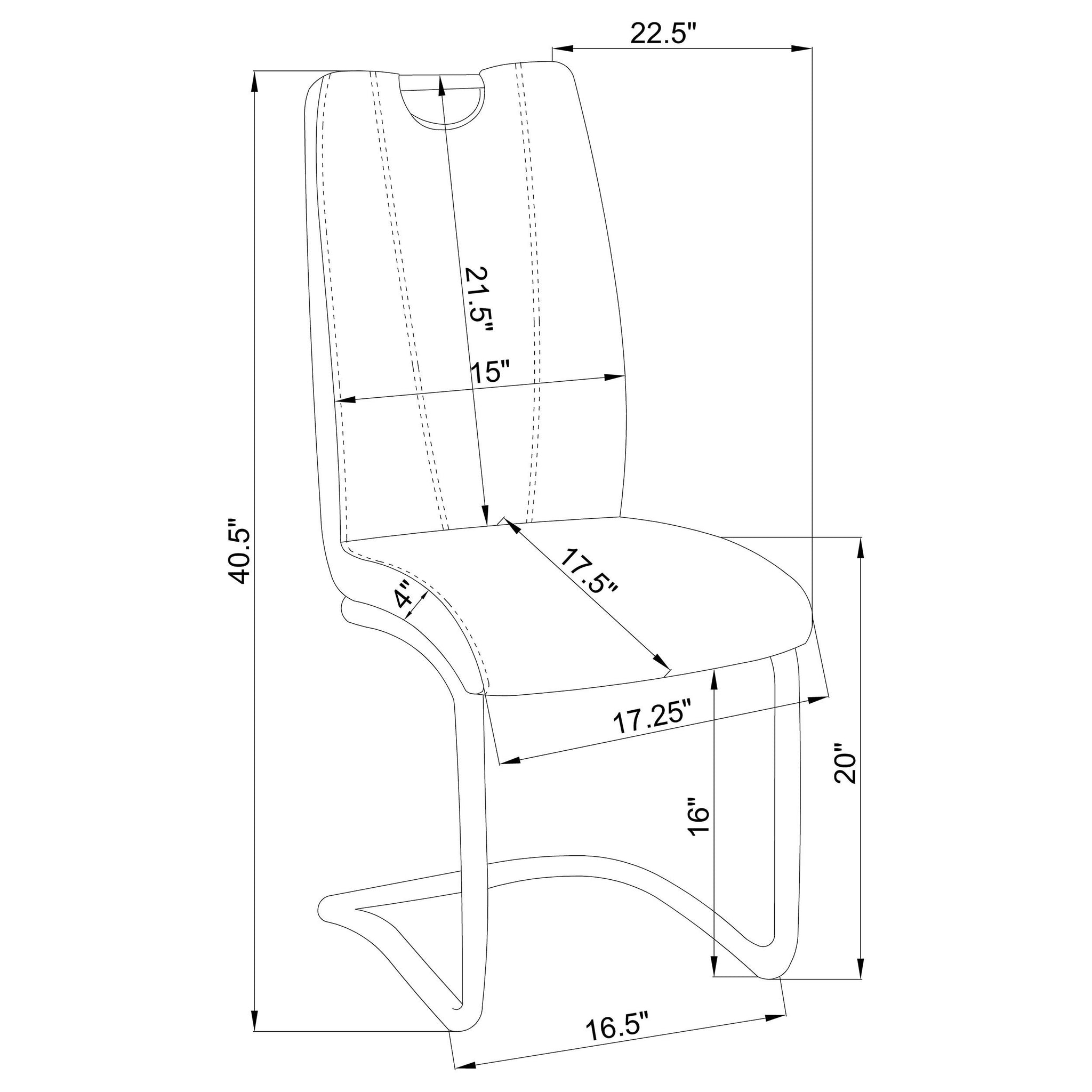 Give your entertainment area an ultra-modern feel with this five-piece dining table set. A spacious rectangular table with a gleaming high gloss white finish is supported by three stainless steel supports in a lustrous chrome finish that rest on a flush base that mirrors the top. With a pedestal-like design, the dining table invites each of the four cantilever style dining chairs to slide up for meals and conversations. Sit back and rest in the upholstered seats, wrapped in a two-tone gray and white leatherette that accents the contoured shapes. Mounted on a polished chrome metal base, the cantilever design chairs also offer an open, airy feel that showcases the table.