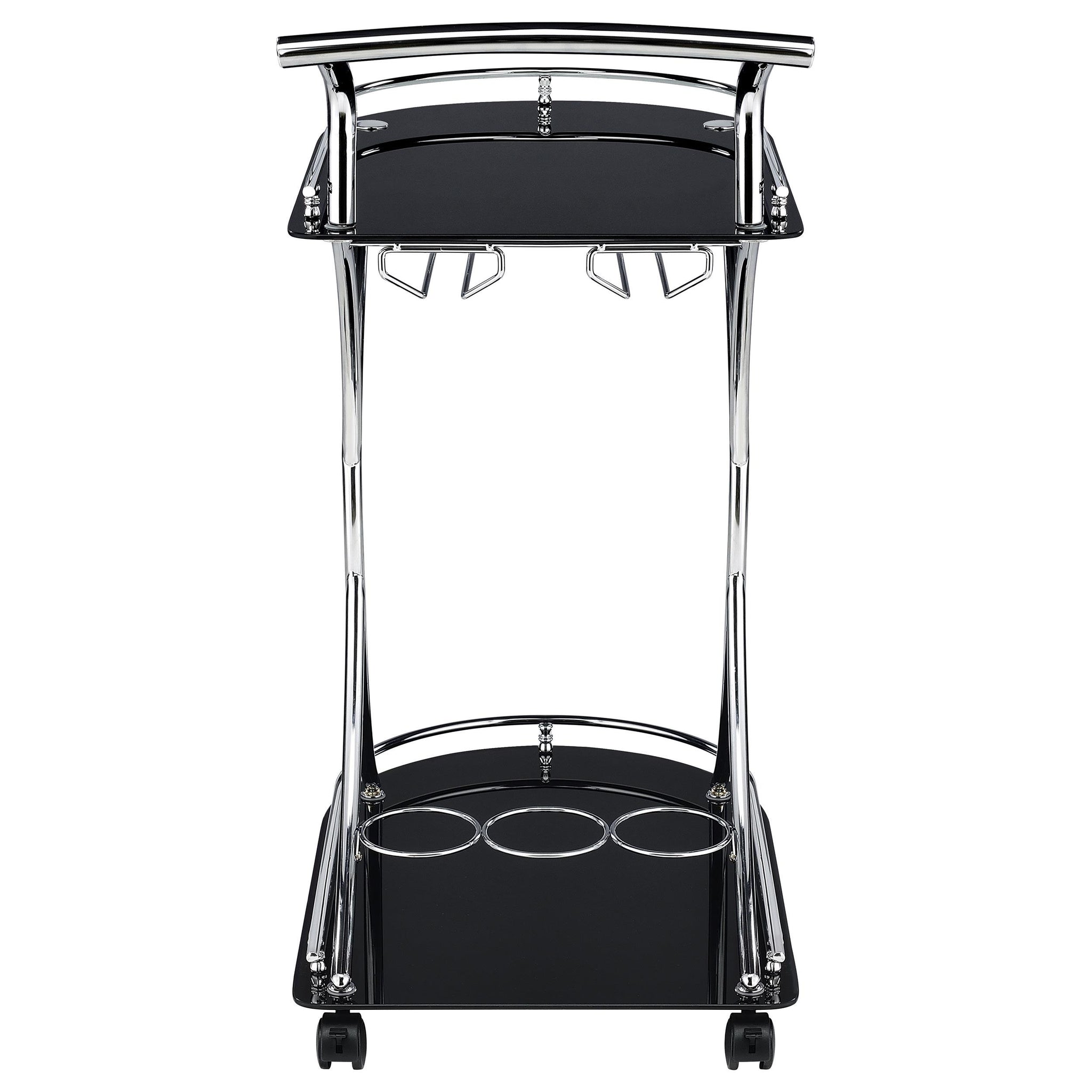 Recapture mid-century elegance with an enticing function. Slender construction elements form a graceful look in this mobile serving cart and add a lovely accent piece thats also useful for entertaining. Sleek black glass serves as a top and bottom shelf, contributing to an upscale flavor. Chrome finish metal accents round out a luscious palette. Serve and store with a pair of wine bottle holders and a stemware rack.