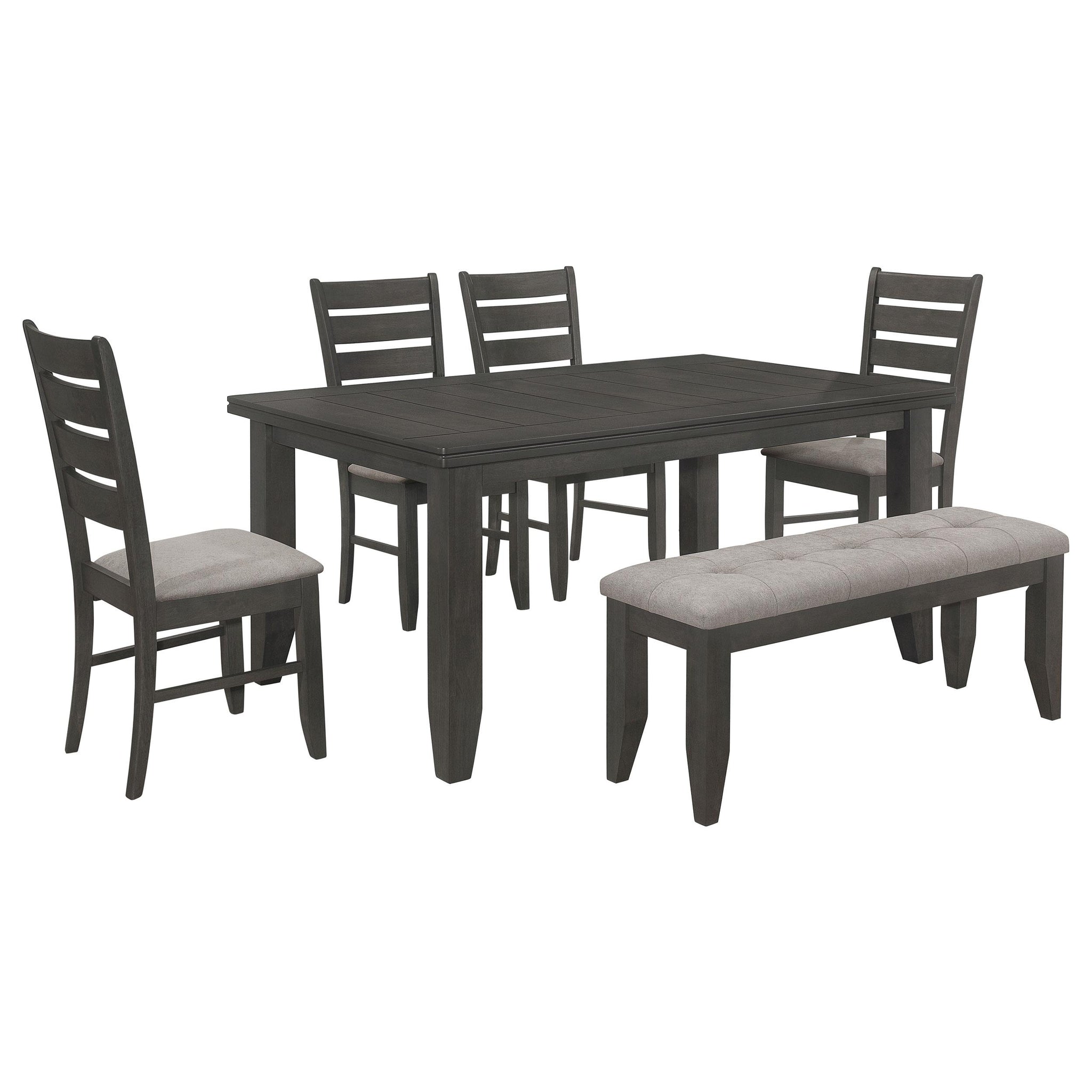 Offering flexible seating and a timeless aesthetic, this dining set includes a plank-style dining table, matching chairs, and a coordinating bench. The solid wood construction ensures durability, while the ladder-back chairs and padded bench provide comfort and support. Whether used for casual meals or formal dining, this set offers versatile seating arrangements, making it a stylish and practical choice for modern, transitional, and traditional interiors.